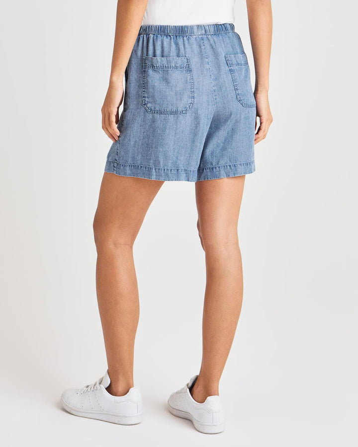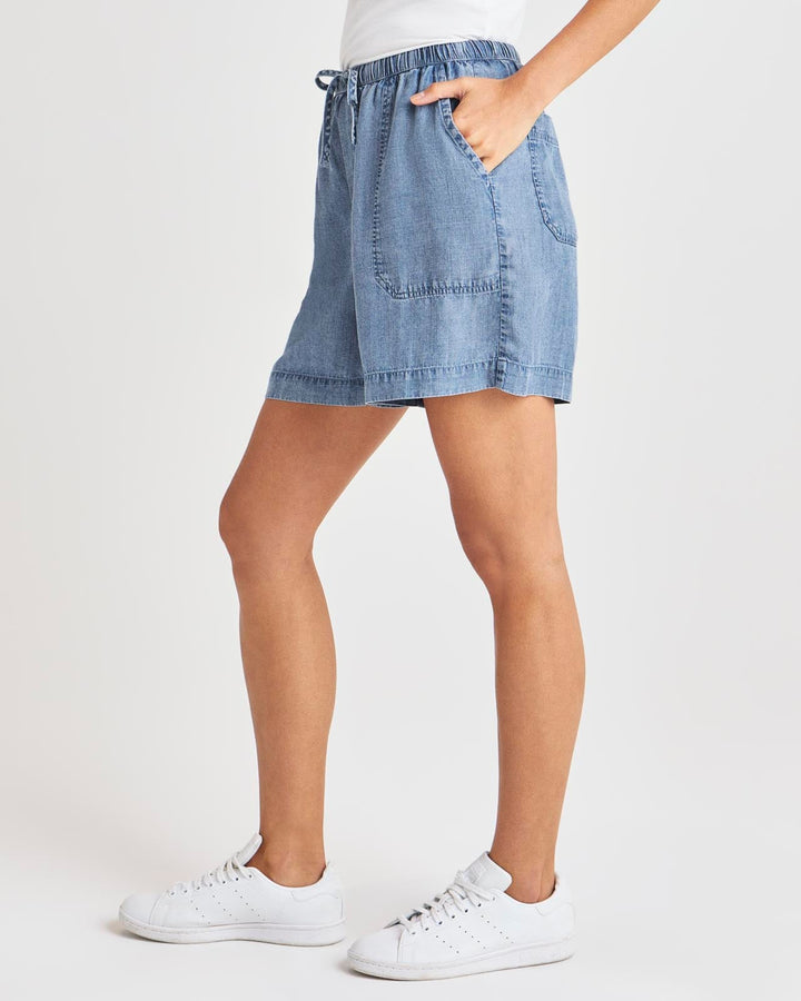 Inspired by our best-selling Angie Crop Wide Leg Pant, this short has a relaxed fit with front and back pockets, and is topped by a comfortable drawstring waistband. Its ultra lightweight feel comes from its indigo Lyocell fabrication. Pair with any tee or tank, or match it back to the Chase Indigo Vest for a monochrome summer look.