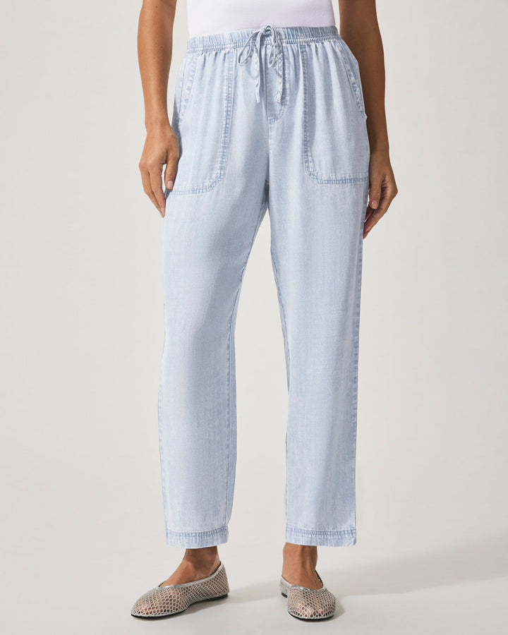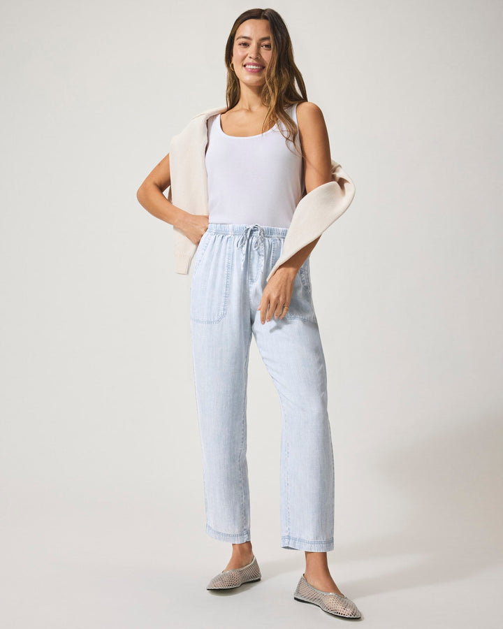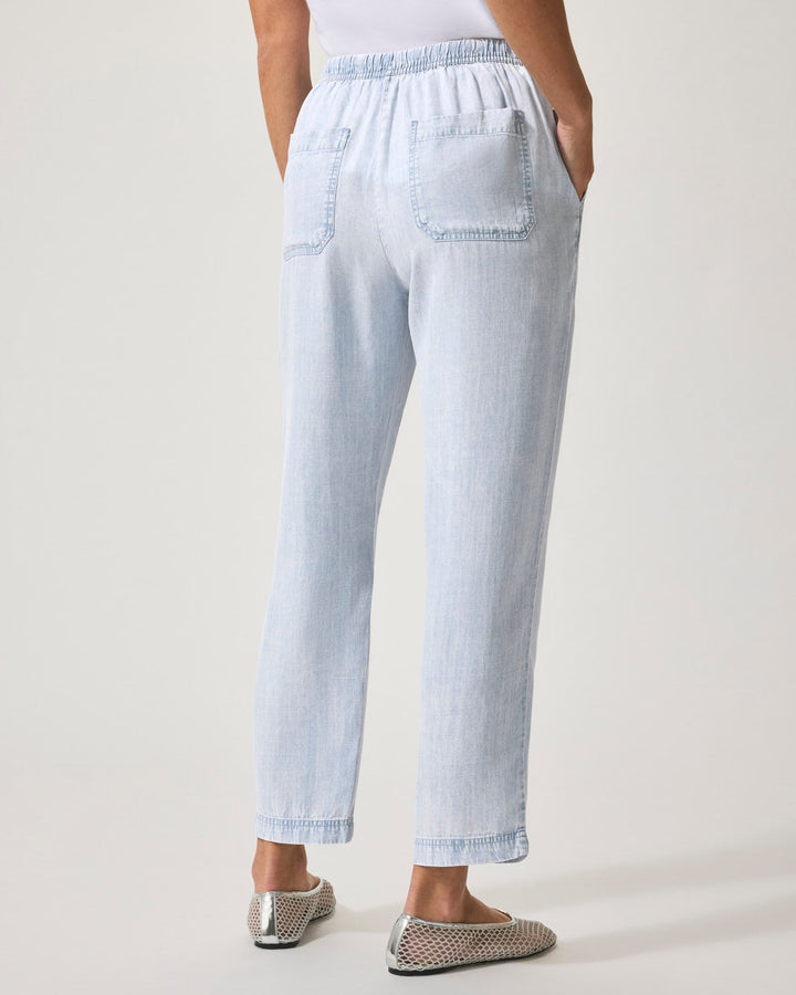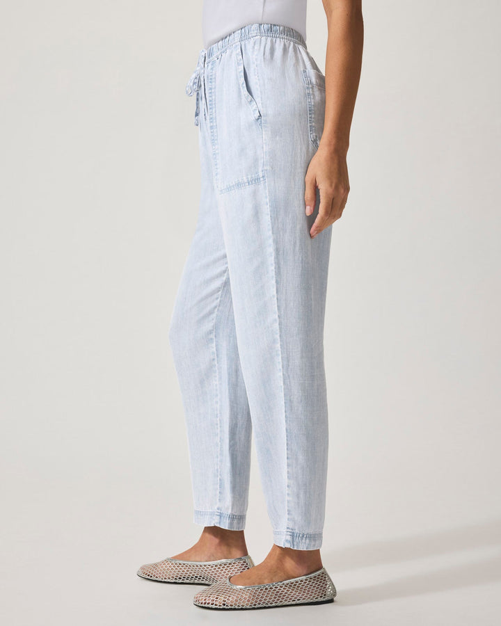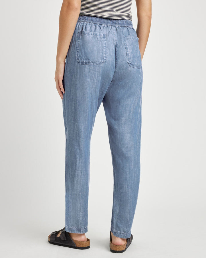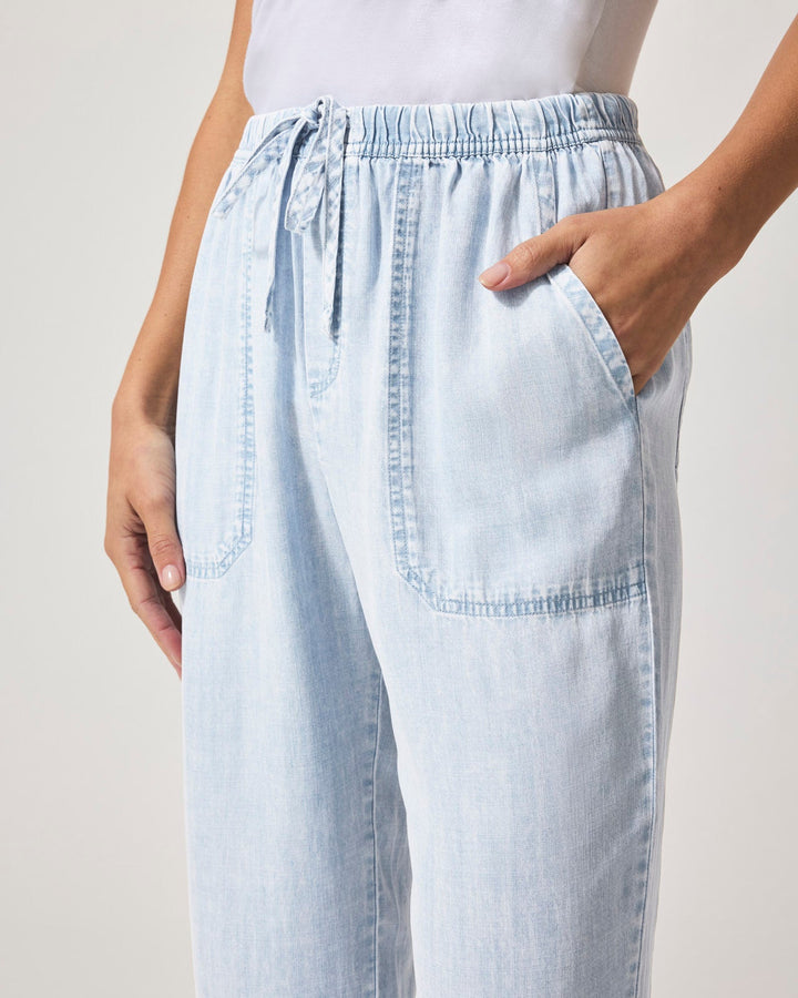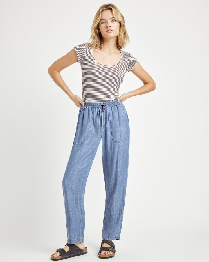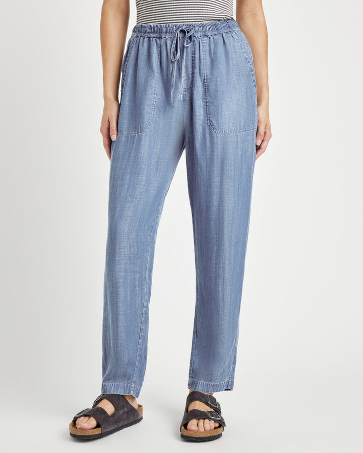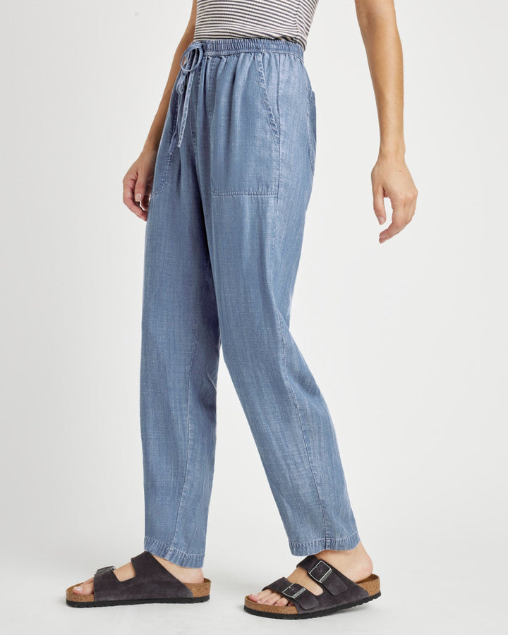 Our best-selling Angie Pant is crafted in a straight leg version. This Indigo Straight Leg Pant is cut from lightweight indigo lyocell for effortless looks. Designed with an elastic waistband and distinctive roped drawcord, these pants offer a comfortable fit that's perfect for all-day wear. The relaxed straight leg silhouette, complemented by seamed patch pockets, adds a polished touch to any outfit.