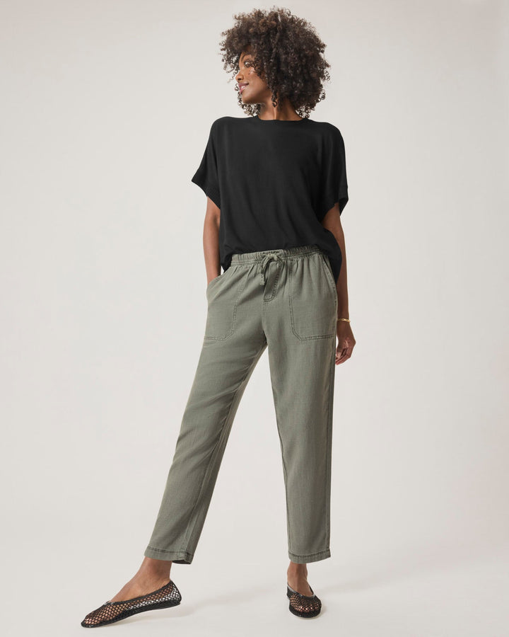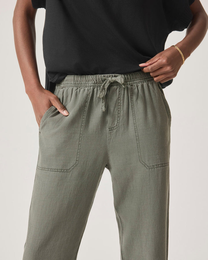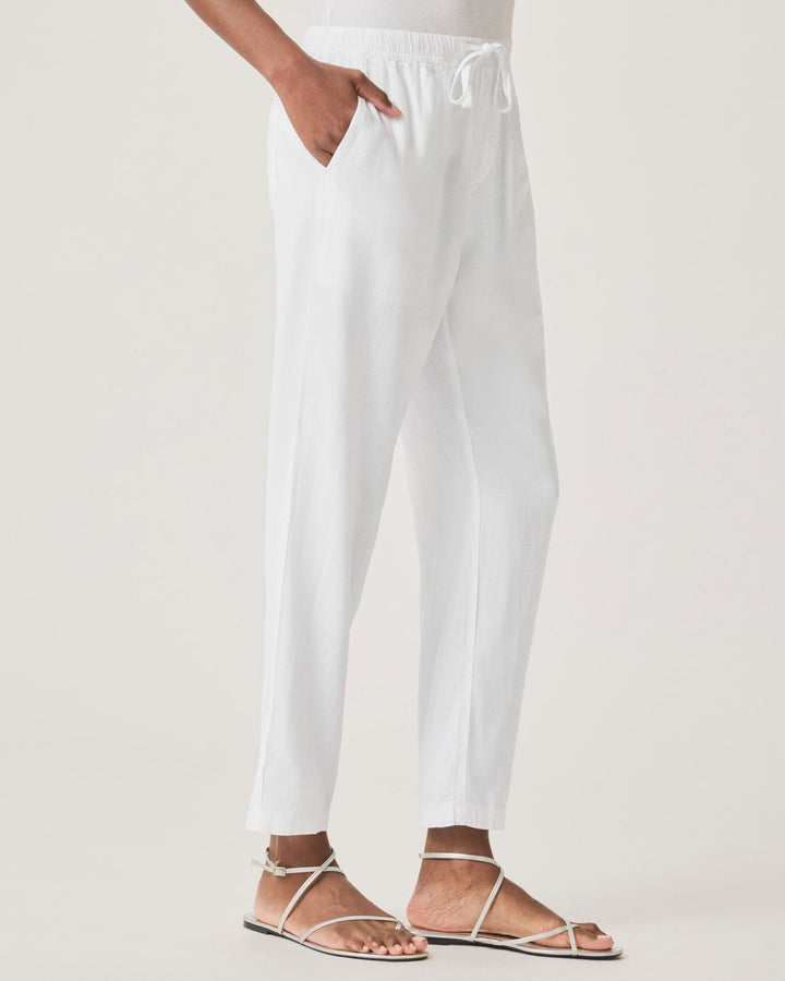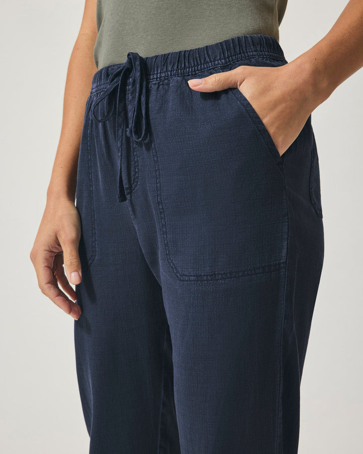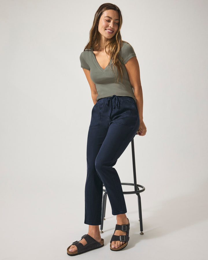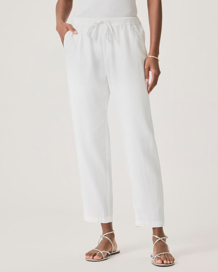 The straight leg version of our best-selling Angie Crop Wide Leg pant, these linen-blend bottoms are sure to become a fast favorite. This effortless style takes you from WFH to weekend outings. It's topped with a stretchy drawstring waist with seamed patch pockets. The hem hits just above the ankle so you can rock them with sandals, slides, sneakers-- take your pick.