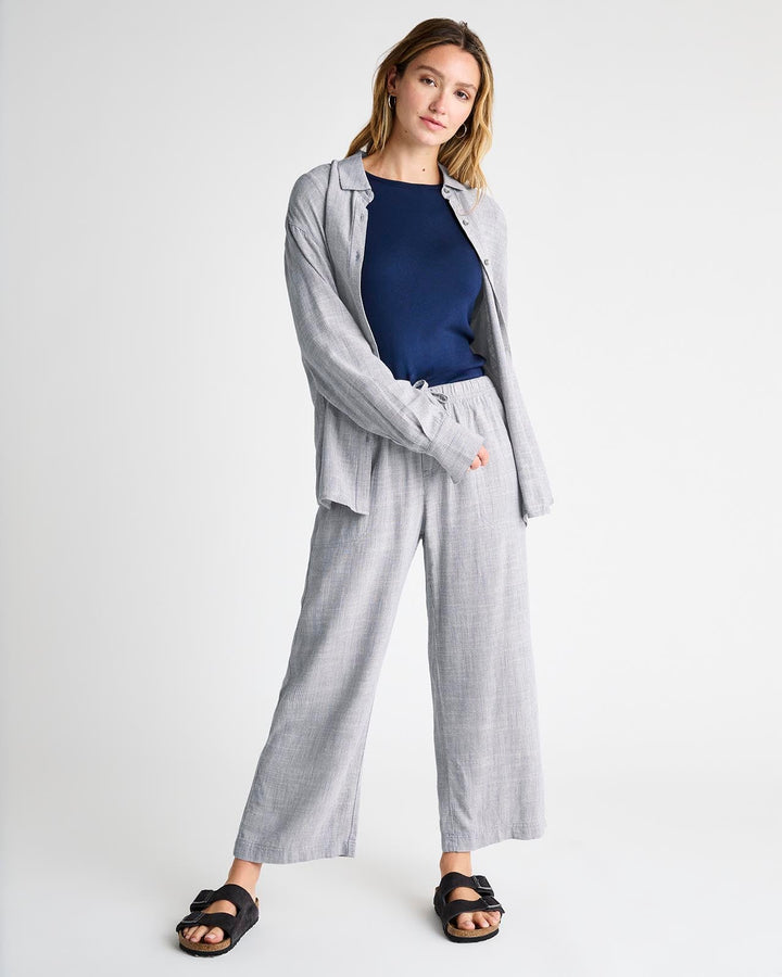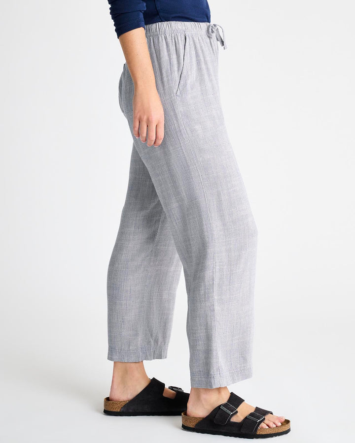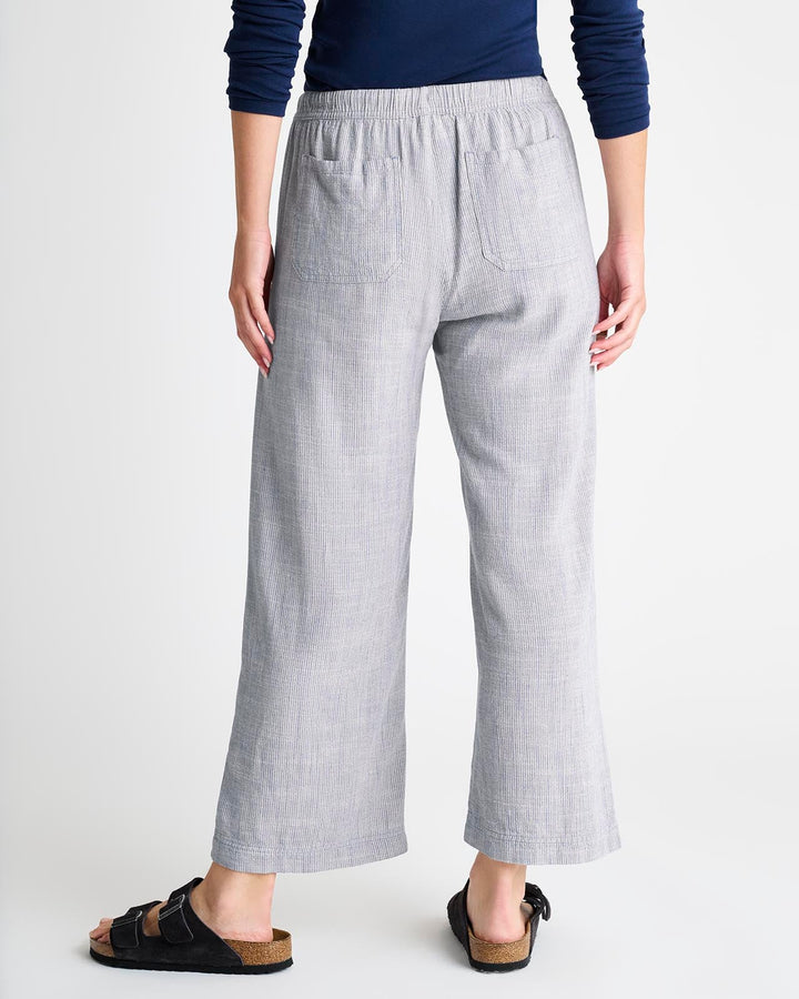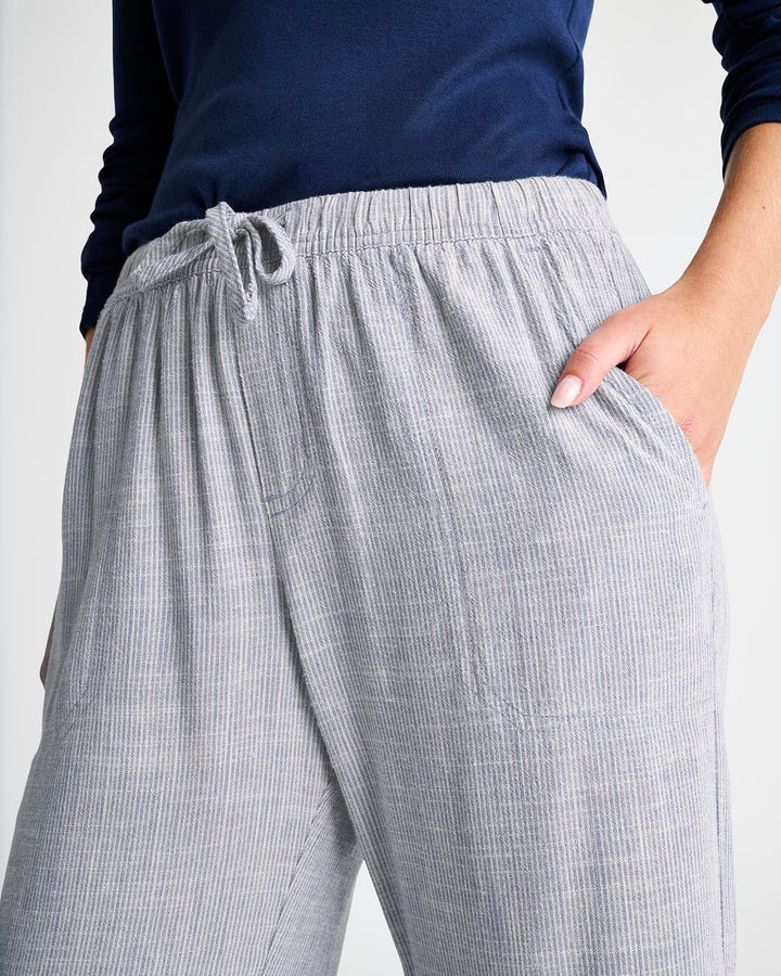 Our best-selling Angie Pant is back-- this time made from stripe dyed yarn. These can be worn just about anywhere -- from WFH to weekend outings. It's topped with a unique roped drawcord on a stretchy waist with seamed patch pockets. And, we just love the wide-leg silhouette that gives it a flowy, sophisticated finish. Pair it with a basic topper and some slides and you're good to go.