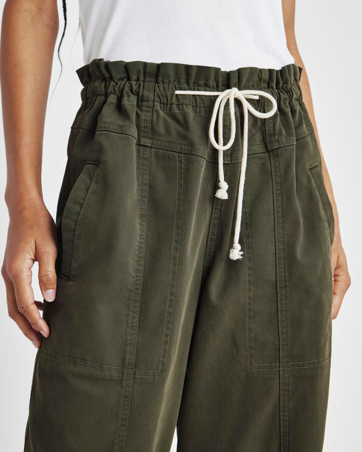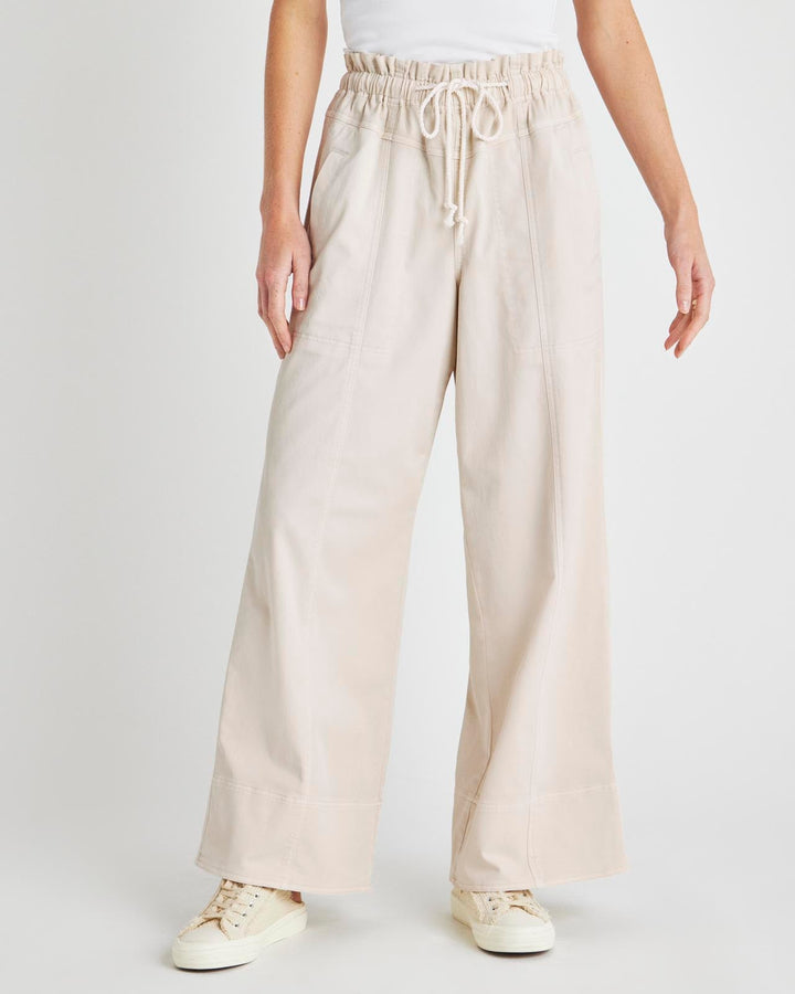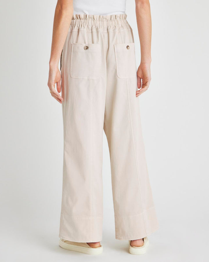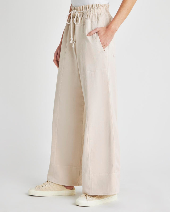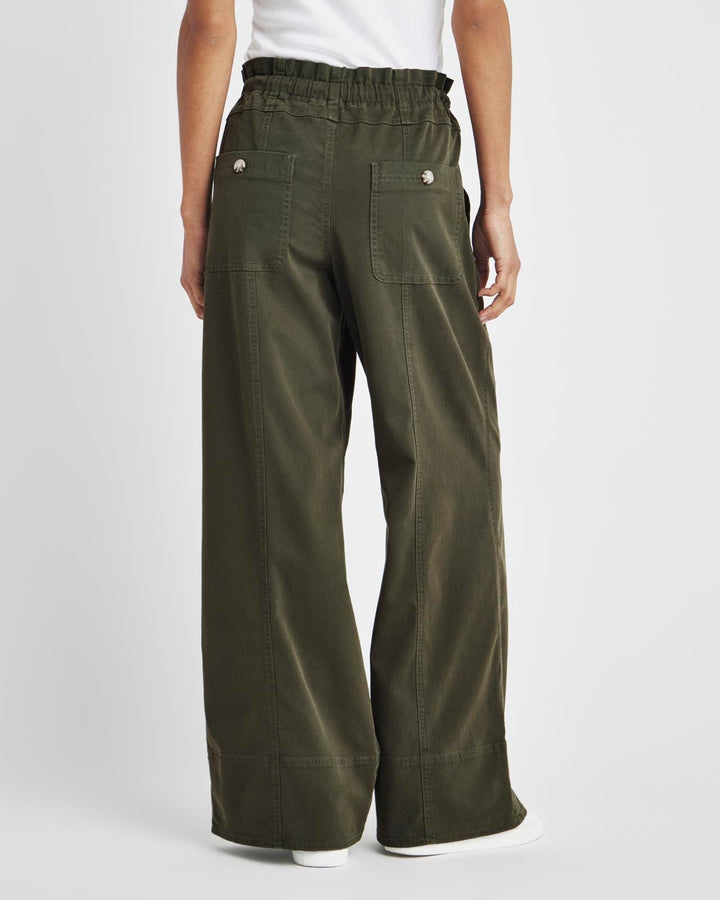 This twill pant will quickly become your new spring favorite. It's crafted with a high paperbag waist and a charming roped drawcord. The full-length wide leg is super relaxed while the seam details add a unique casual finish.