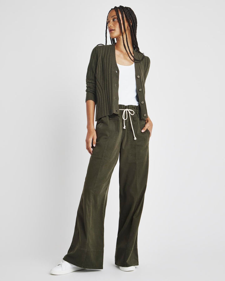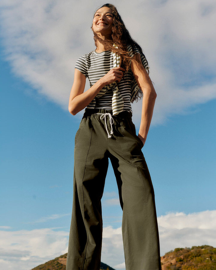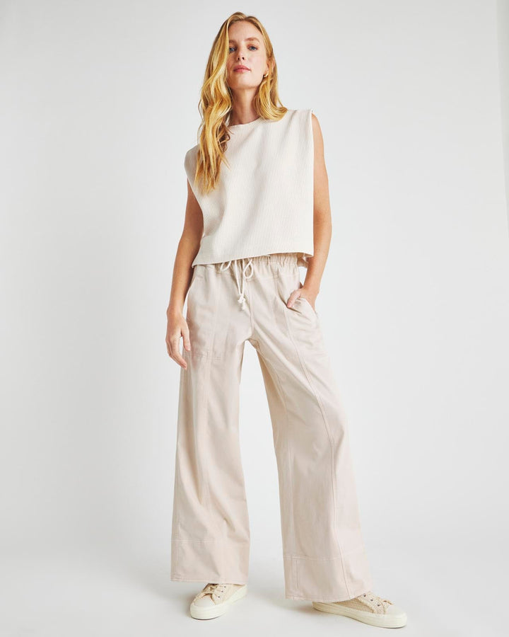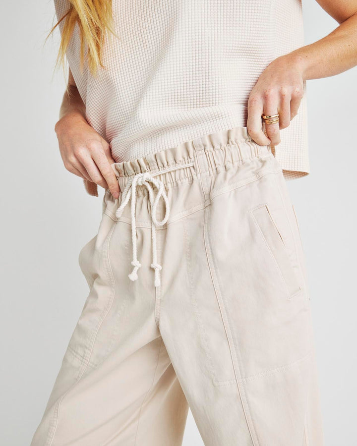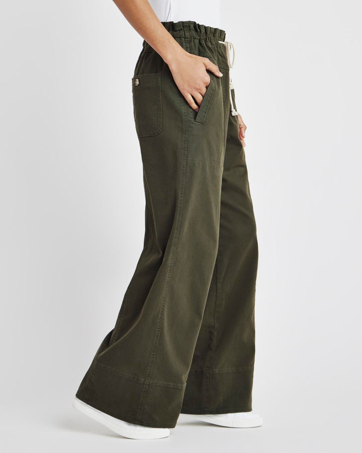 This twill pant will quickly become your new spring favorite. It's crafted with a high paperbag waist and a charming roped drawcord. The full-length wide leg is super relaxed while the seam details add a unique casual finish.