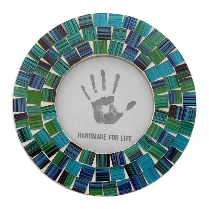 This modern picture frame showcases the art of glass mosaic in beautiful shades of blue and green. From Kamal in India, the circular frame is crafted by hand to display a favorite 4 by 4 inch photograph.