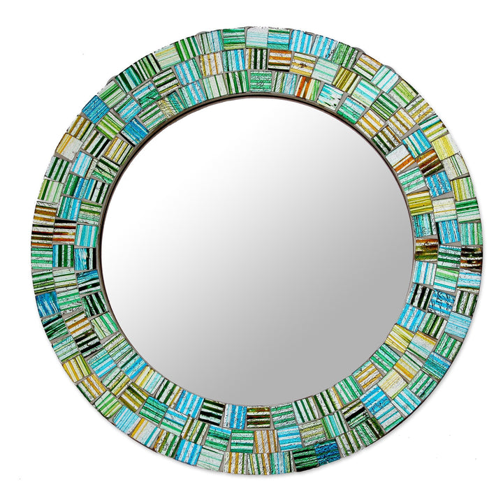Striped glass tiles in shades of blue, green, and gold are carefully placed on a wood backing on this round mirror from India's Kamal. The tiles are laid in alternating directions, creating a criss-cross, trellis-like design. Take a step back, and the harmonious colors combine to give you an overall impression of cool aqua. The versatile hand-crafted mirror can be placed on a wall or on a table.