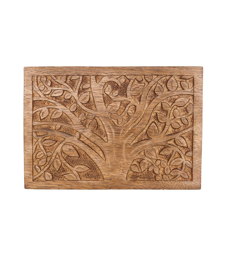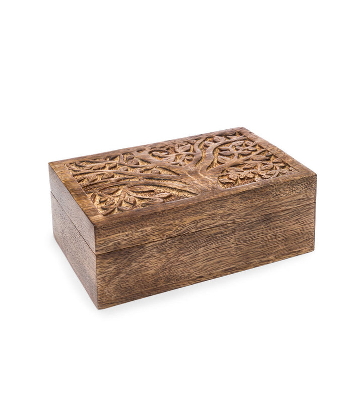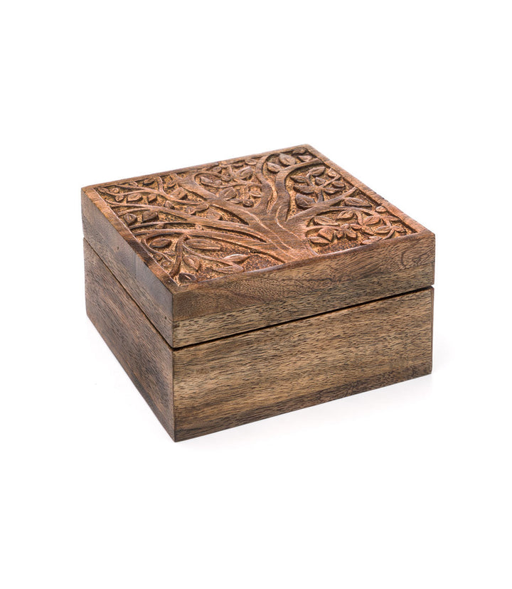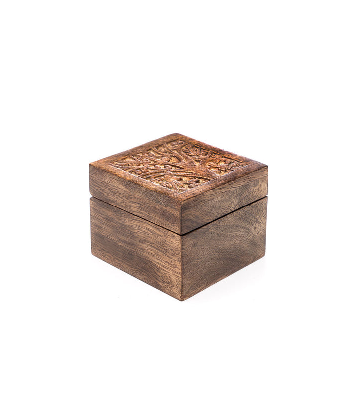 Hold your small jewelry items in this cute trinket box. This ethically sourced mango wood box with removable storage tray features a hand carved tree of life design honoring Forest Goddess Aranyani.
