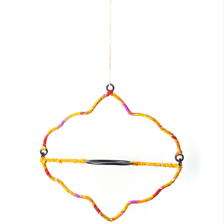 Our Sari Air Element Planter Collection incorporates age-old techniques of pottery and metalworking in modern, eco chic designs with a splash of vibrant color. Pottery is an age-old art from which has been passed down for generations in Rajasthan. Vibrant, upcycled sari accents provide for a one of a kind quality. Handcrafted hanging planter features small terracotta pot suspended in an airy arches motif setting with assorted, upcycled sari wrapping. With drainage hole.