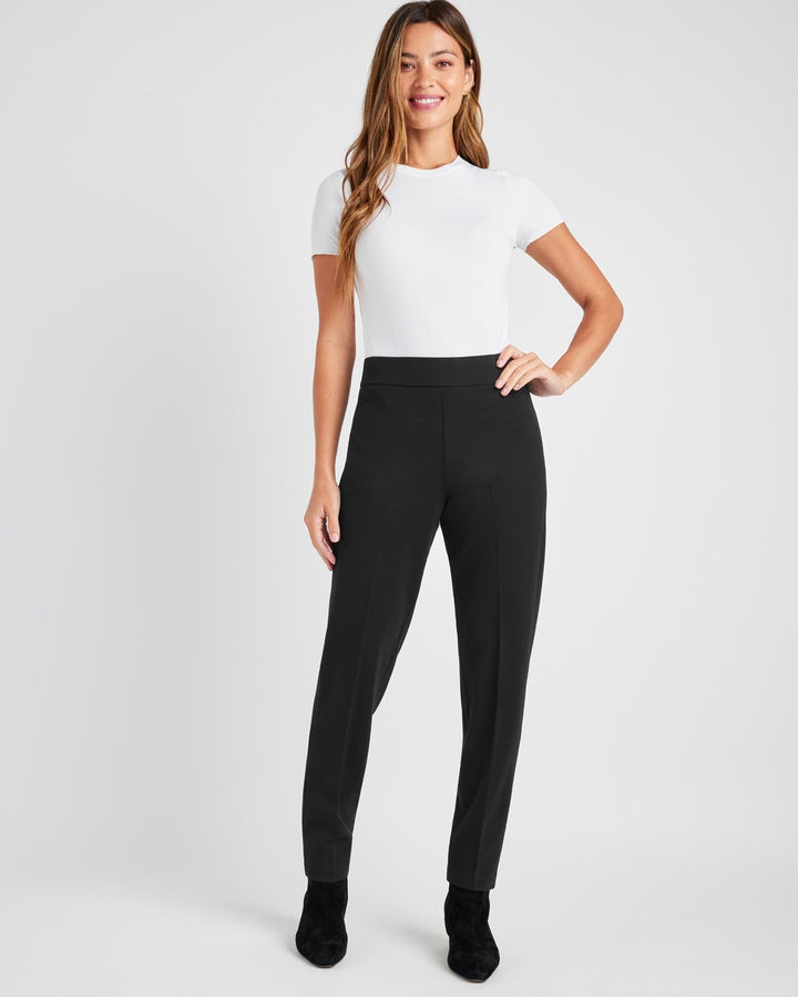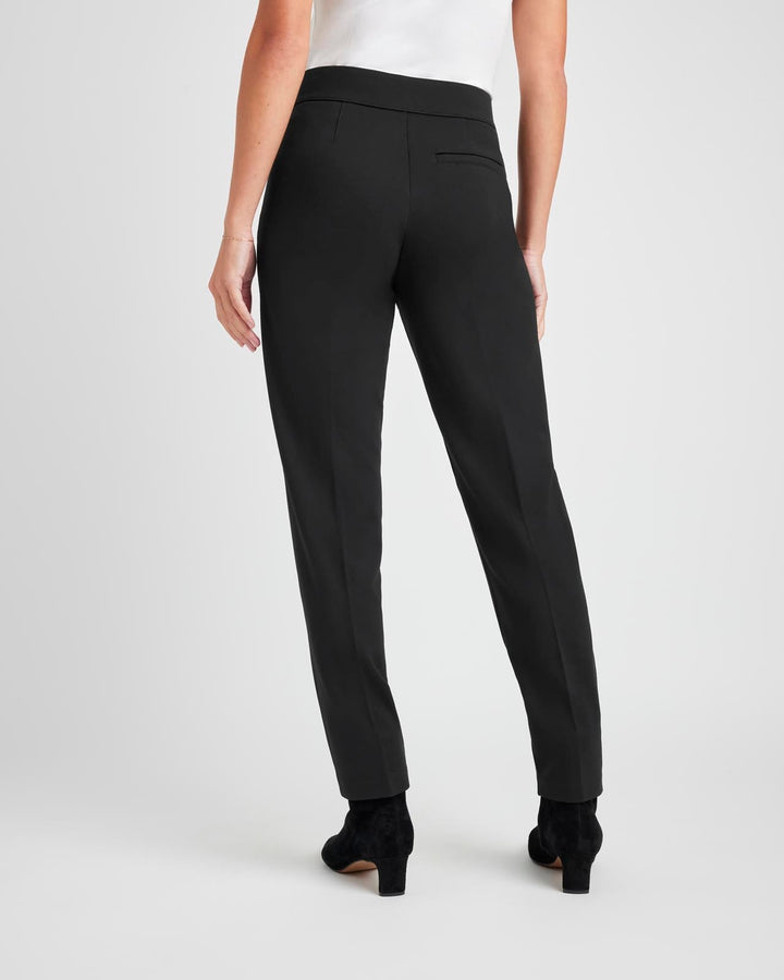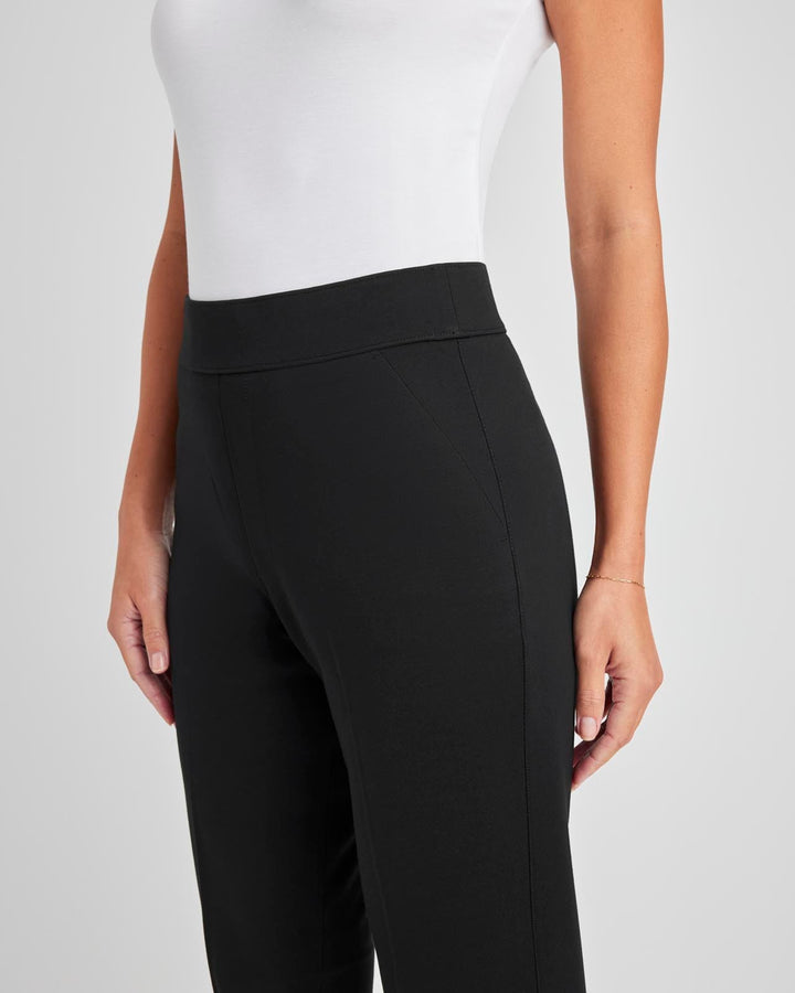 A polished trouser for work or after-hours. The Arianna Pant is a pull-on style ponte pant with a flat elastic waistband, front slash pockets and a mock back pocket. Its slim leg features a front crease and is slightly tapered at the ankle for a sleek look.
