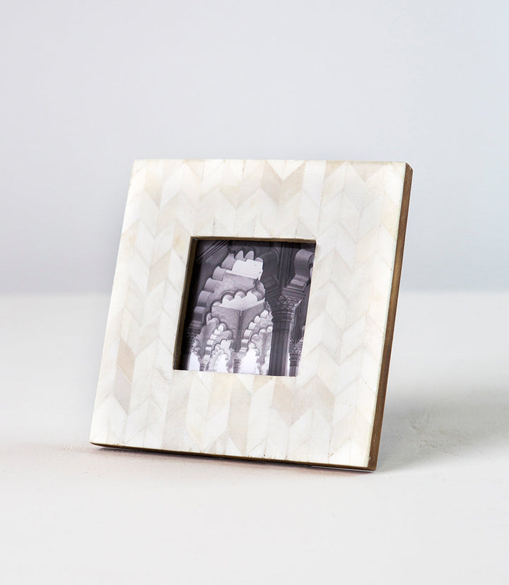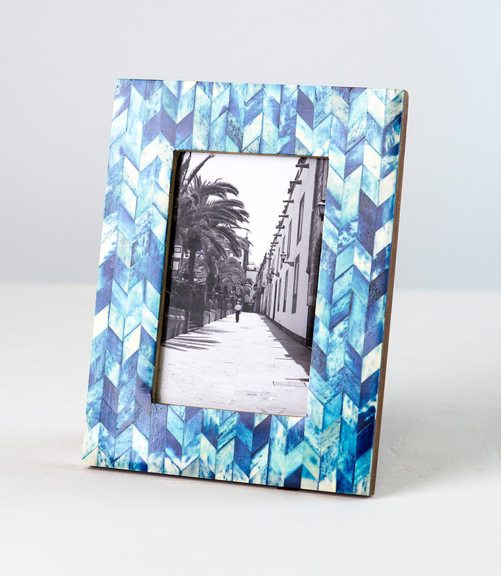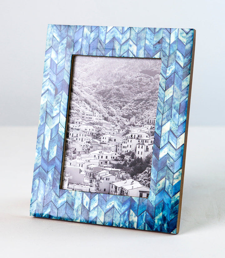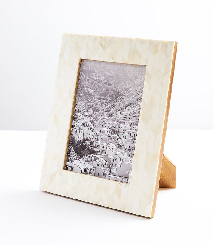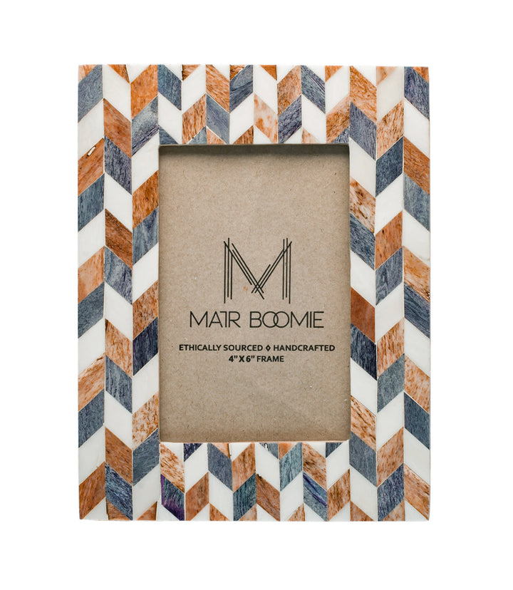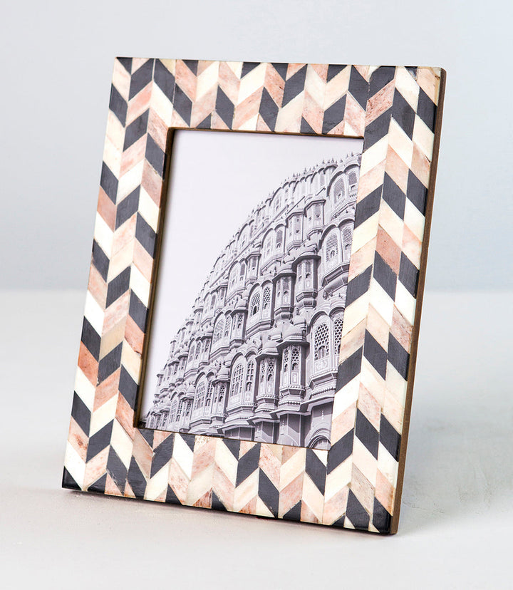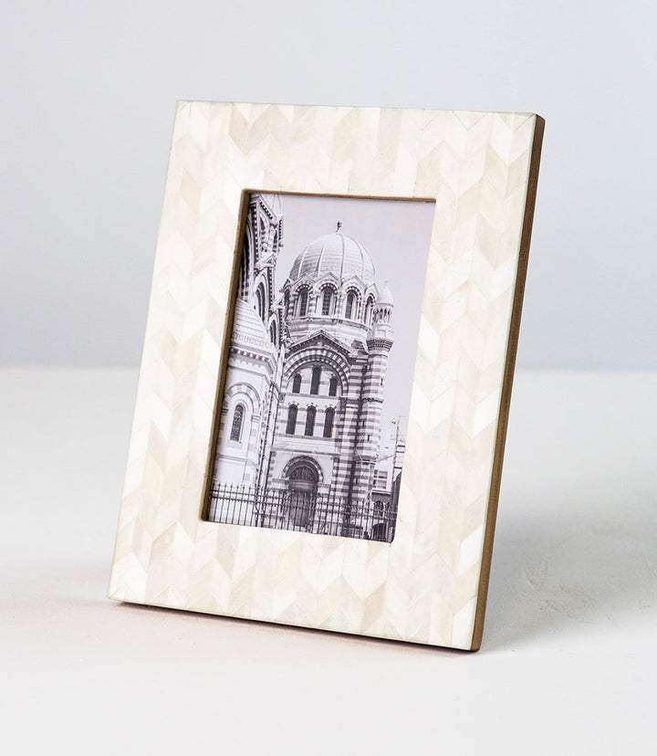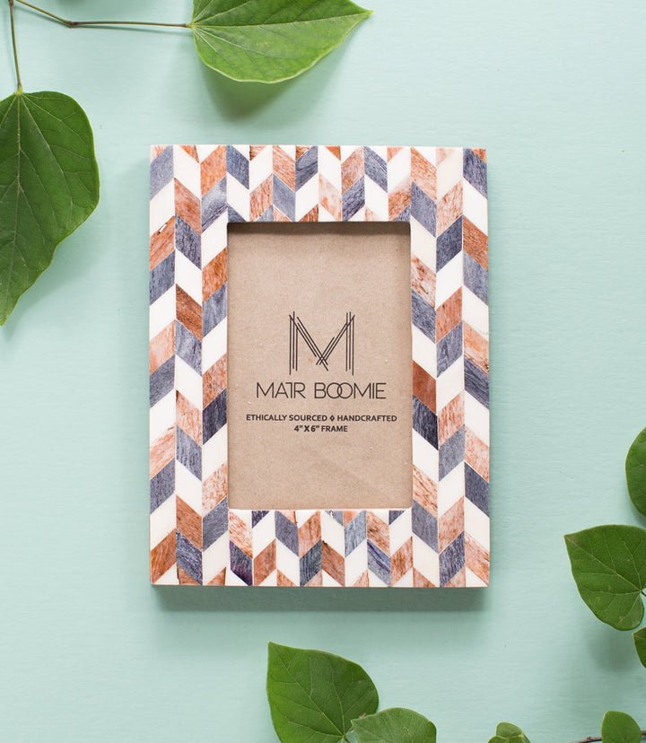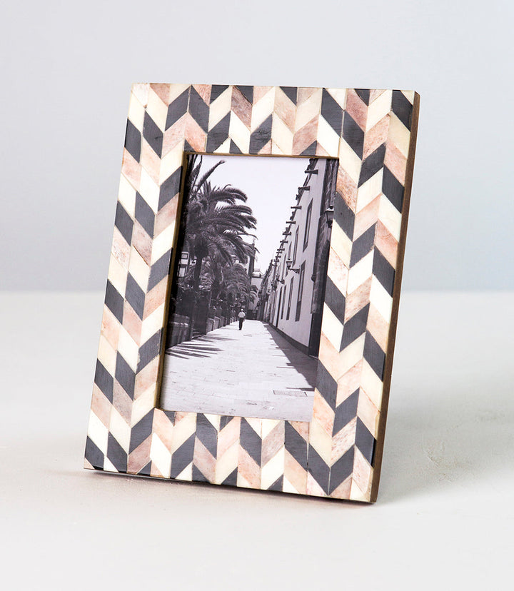 Display your most treasured memories in this frame made of cruelty-free, ethically sourced bone in a mosaic chevron pattern inlay.