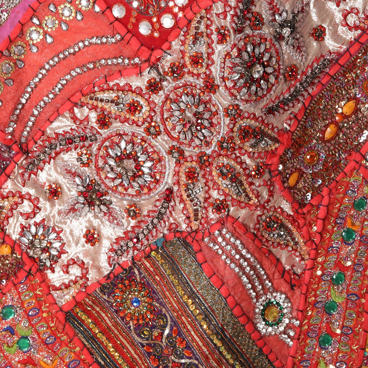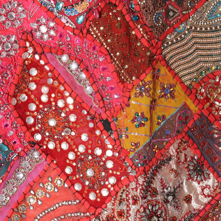 From Meena in India, the images are achieved with rich appliqué and glittering zardozi embroidery. Beadwork and sequins embellish a landscape with autumn's glorious colors. As a token of nature, sheesham wood beads suggest fertile seeds.