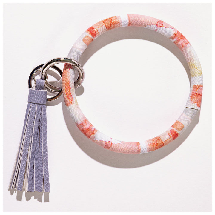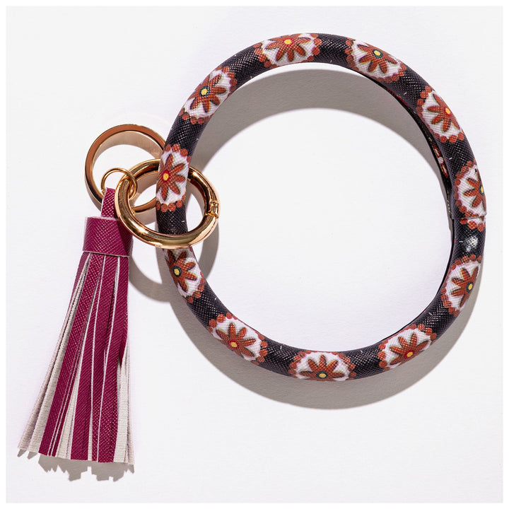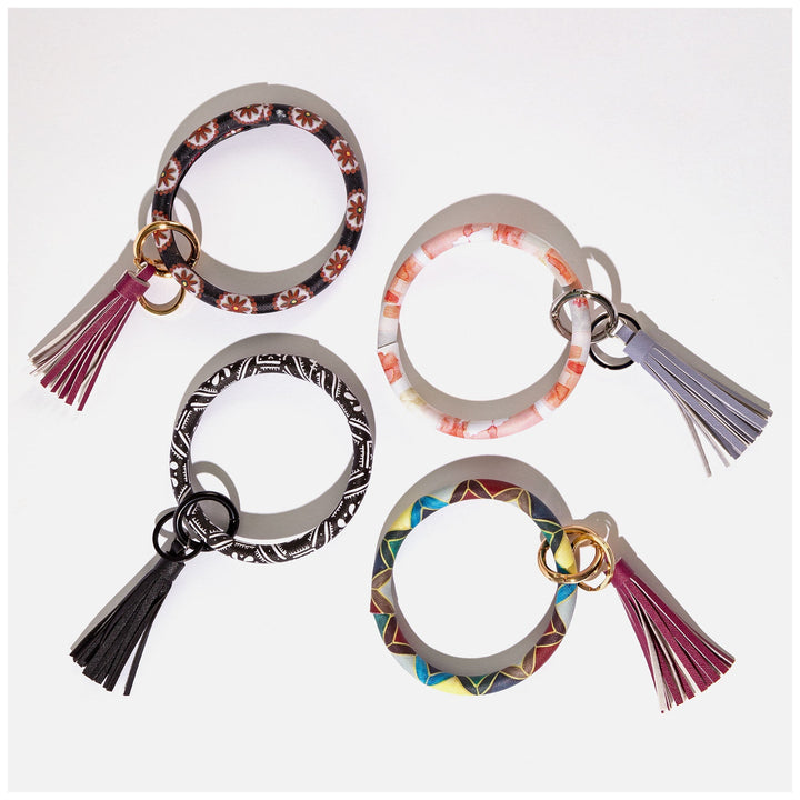 Wrapped in an array of colorful designs and topped with a brilliant tassel all in a textured faux leather, this accessory is elevates your keyring!