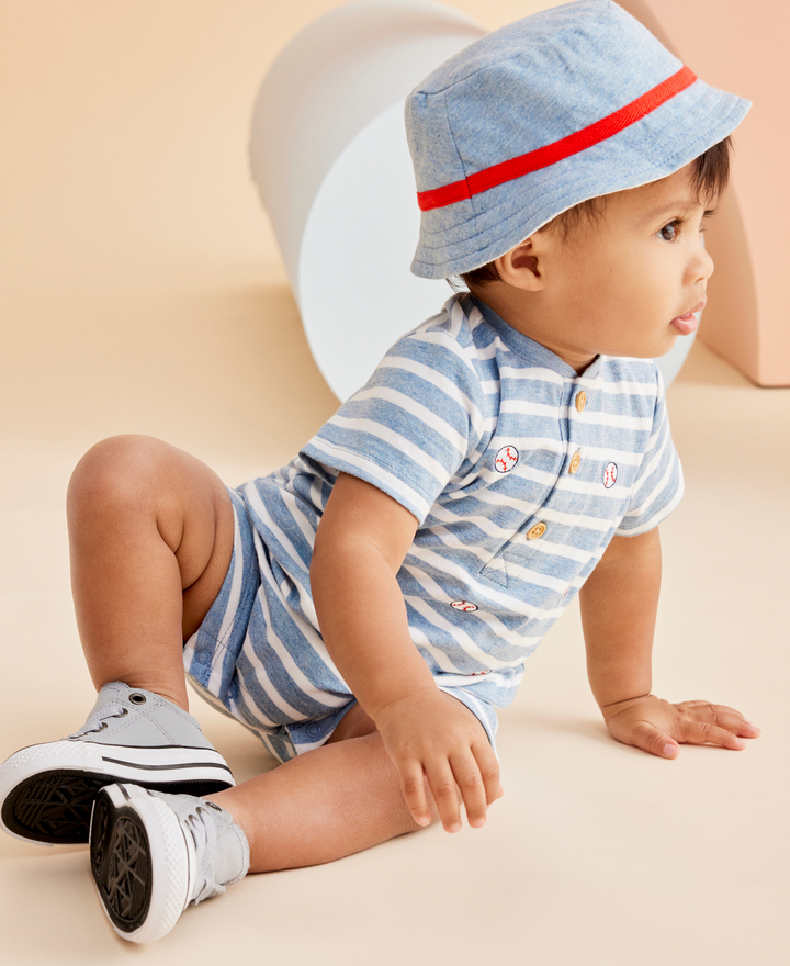 - Your little baseball buddy will be ready for the major leagues in this newborn baby boys' cotton knit short-sleeve romper and matching bucket hat!