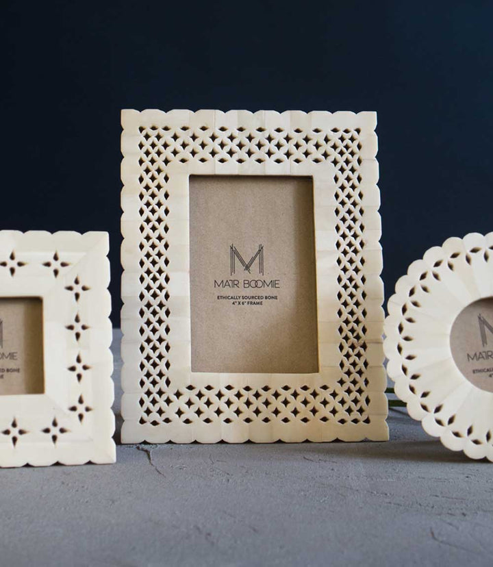 This beautifully carved filigree pearl white bone frame adds the perfect border to your favorite photo or other type of art you'd like to feature.