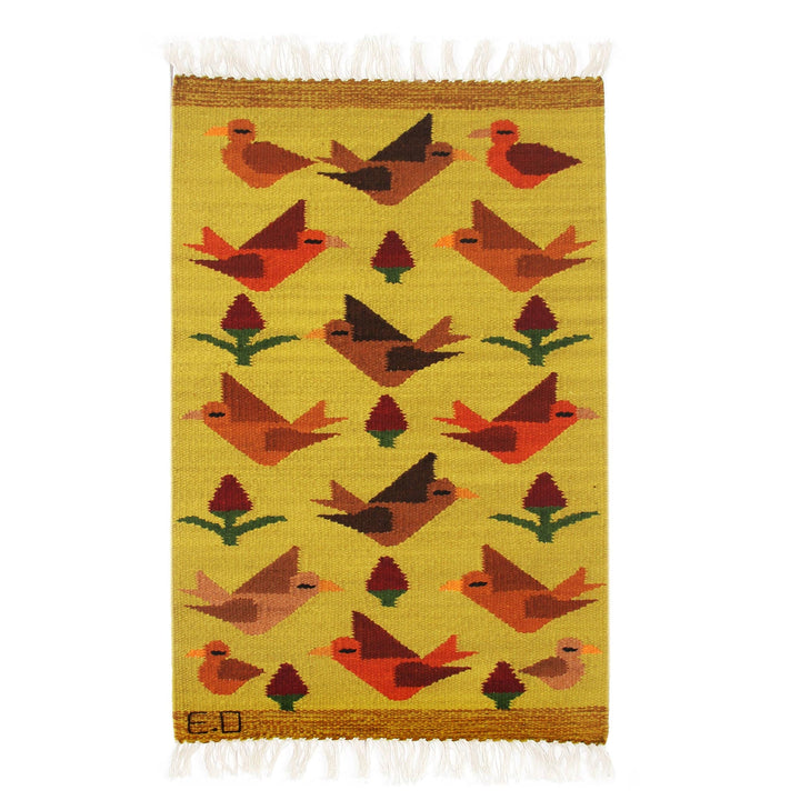 Birds on the Wing Peruvian Handwoven Yellow Wool Rug with Birds