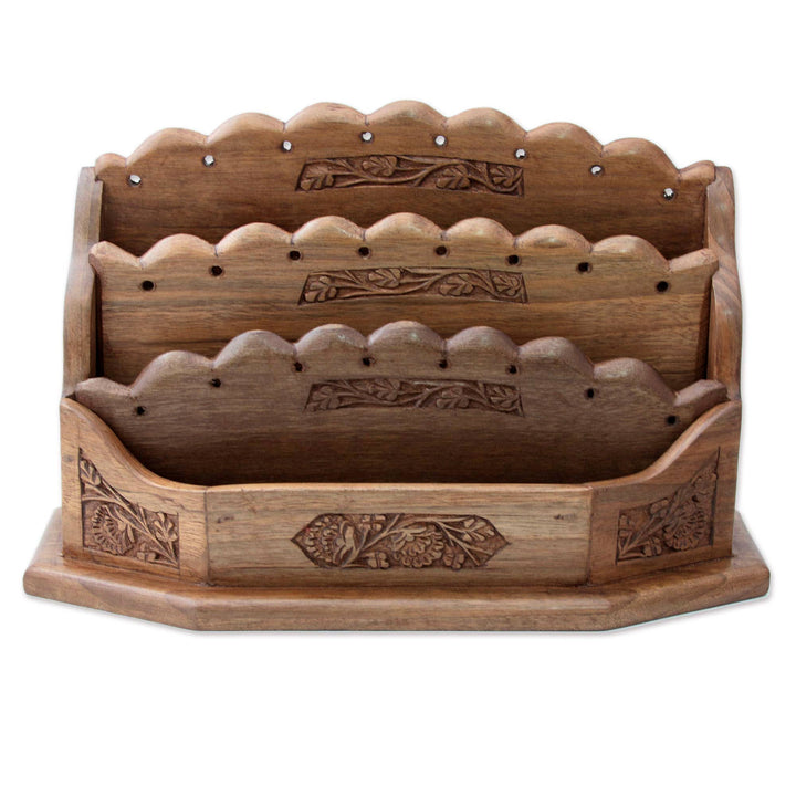 Blooming Floral Vines Artisan Crafted Walnut Wood Letter Rack with Floral Motif