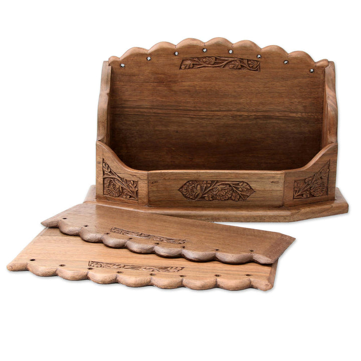 The natural grain of walnut wood shines in this floral letter rack presented by Afroza Ishaq of India. Skilled artisans craft this letter rack by hand by carving floral and leafy motifs into the base and its two removable partitions. This carefully crafted letter rack is the perfect organizing accessory for any home or office.