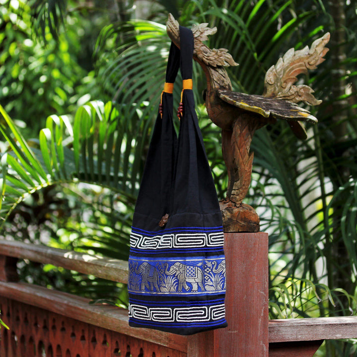 Silver elephants parade across a blue cotton sling tote. A symbol of old Siam, elephants are a favorite in Thailand. Handcrafted by Jiap Rojjana, this bag features a zippered inner pocket for small items.