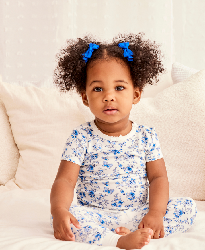 - Dress your little snuggly one for bedtime in our girls' blue garden floral 4-piece pajamas set, crafted with viscose from bamboo fabric for ultimate comfort. This adorable set includes two short-sleeve tops and coordinating bottoms.