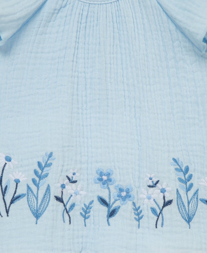 - Blissful blue flowers border this girls' 2-piece cotton gauze sunsuit set and matching headband!