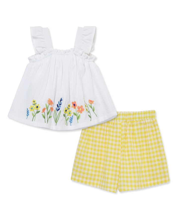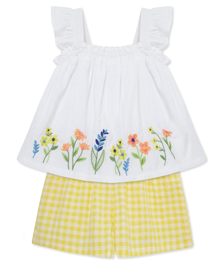 - She'll have spring fever in this girls' cotton woven 2-piece play set, featuring the floral border tunic and coordinating yellow and white check shorts!