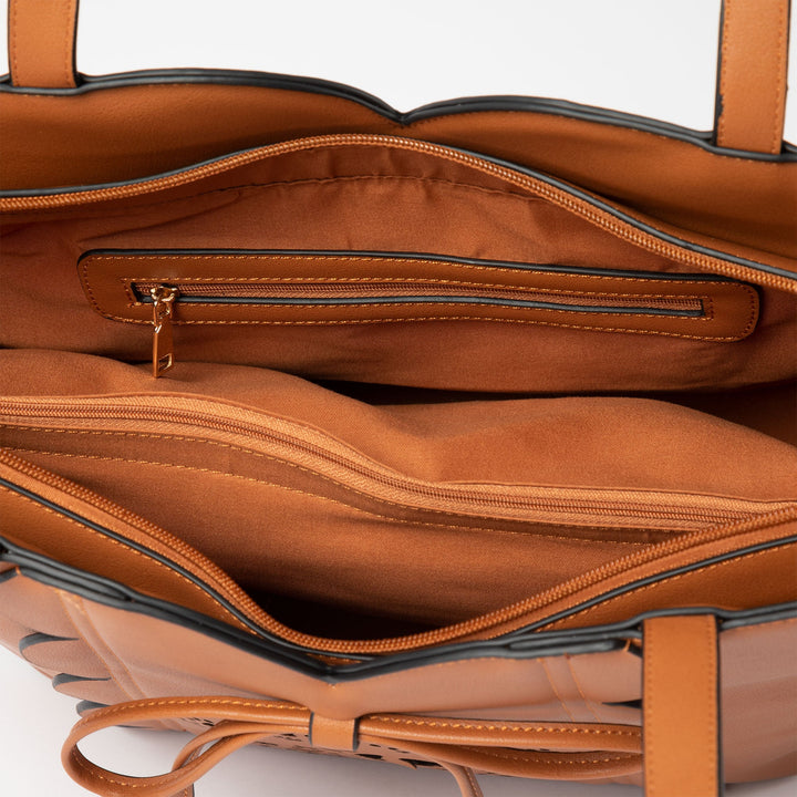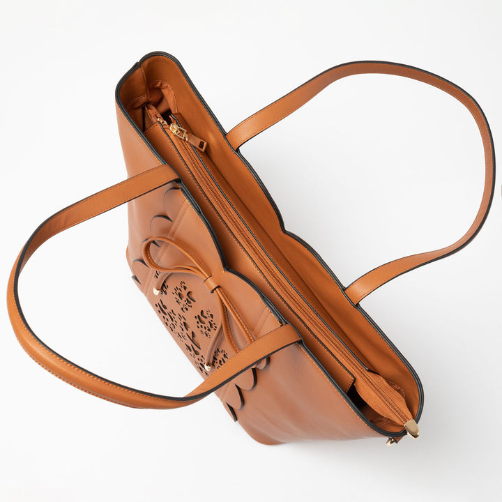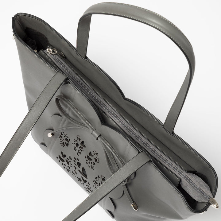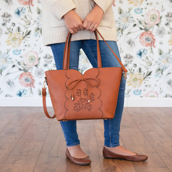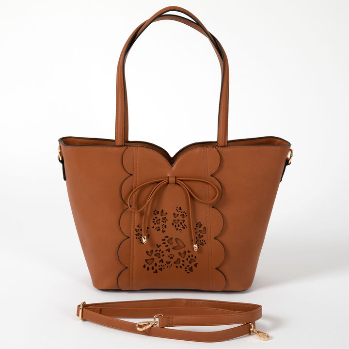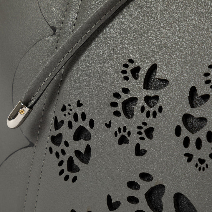 Balancing your need for space and organization with your dedication to animal rescue causes, this structured faux leather handbag checks every box! Use the fixed handle, or the adjustable crossbody/shoulder strap for your most comfortable carrying method, with the zippered pockets and compartments to keep your essentials organized and securely stored. Topped with a charming laser-cut paw print on the front comprised of mini hearts!