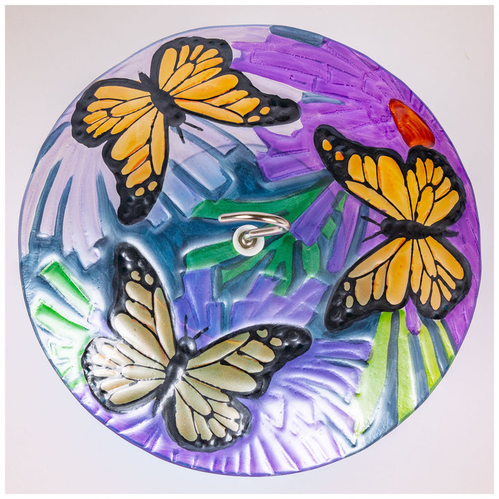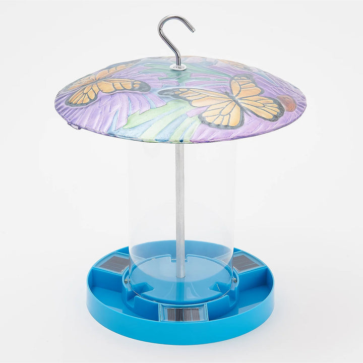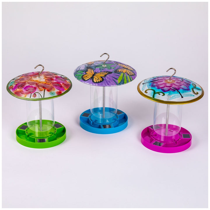 Painted on the upper glass covering of this solar bird feeder is a colorful garden accented with flowers, butterflies, or dragonflies. With solar panels along the bottom rim, this hanging feeder charges during the day, and softly glows at night for a beautiful piece of decor in your outdoor space. Plus, with an easy-to-fill center, birds will know right where to go for food!