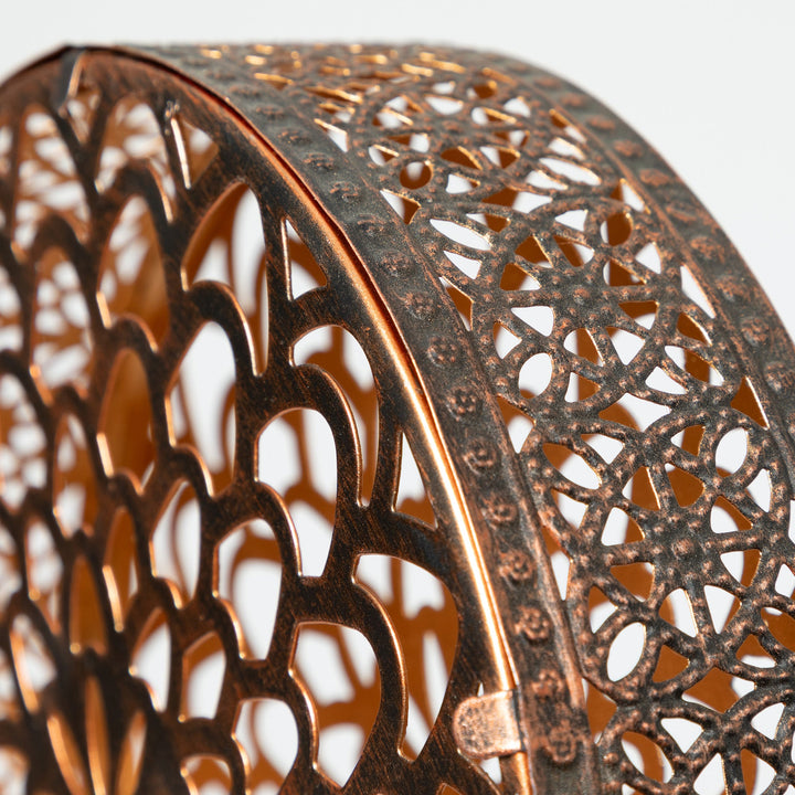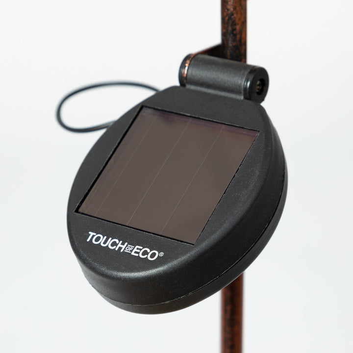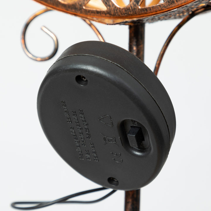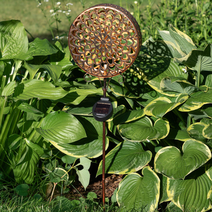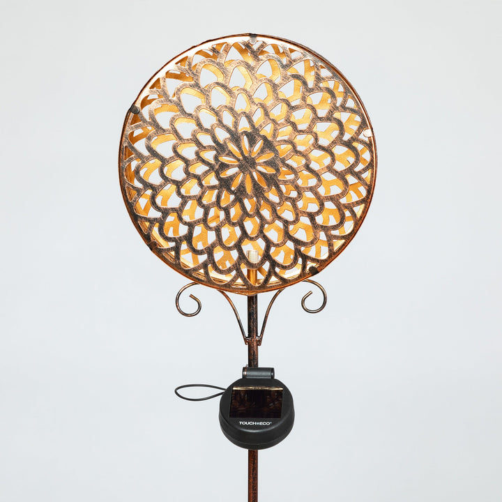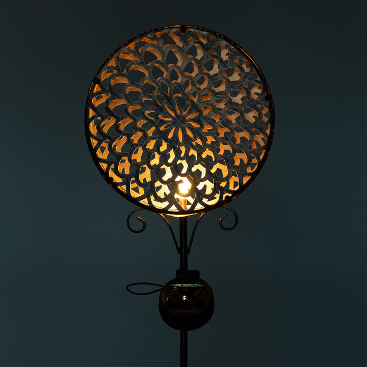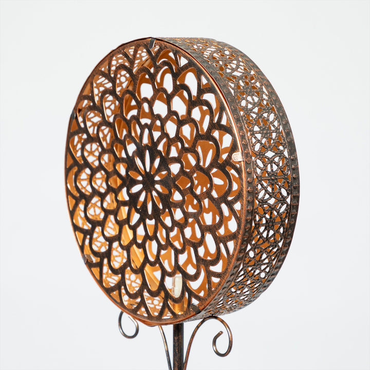 Add a charming decorative glow to your outdoor space with this solar garden stake, featuring an intricate pattern made of durable bronze metal. Admire the delicate reflective design illuminated by the gentle warm white LED that will provide a stunning nighttime visual effect. The built-in day/night sensor will automatically turn on the LED each night and off each morning to charge.