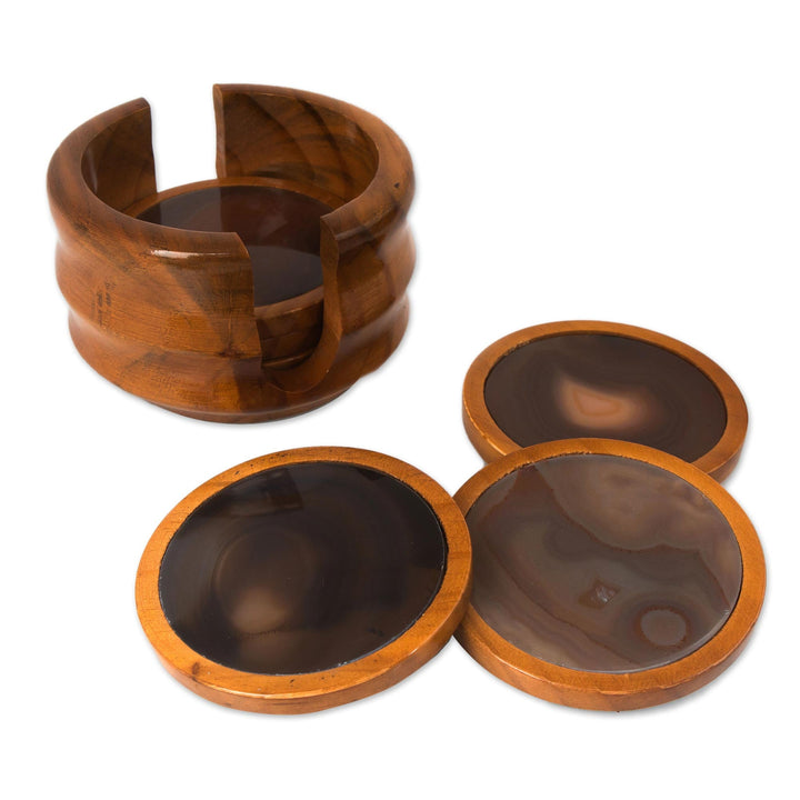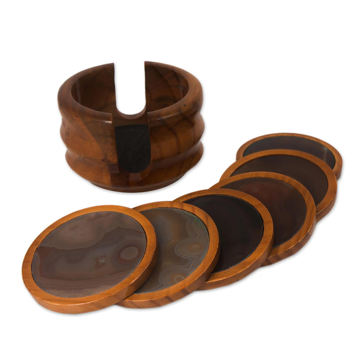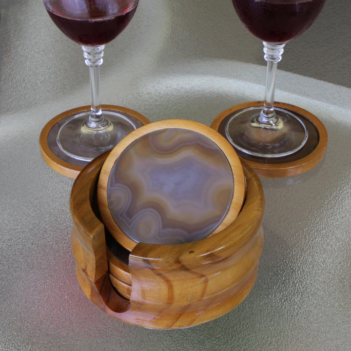 Bright embers burn through mystical gray agate in the design of these attractive coasters. Guena presents each coaster by hand with expert mastery and care. The set of six coasters includes a stand for storage.