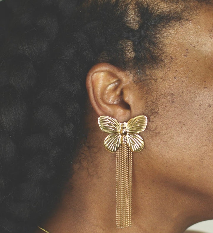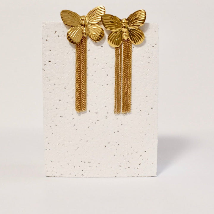 Embrace your unique style with our Gold Butterfly Tassel Earrings, crafted for the modern jewelry lover who appreciates a mix of fun and sophistication. These stylish earrings feature a charming butterfly design accented with elegant fringe tassels, perfect for adding a playful flair to your ensemble.
