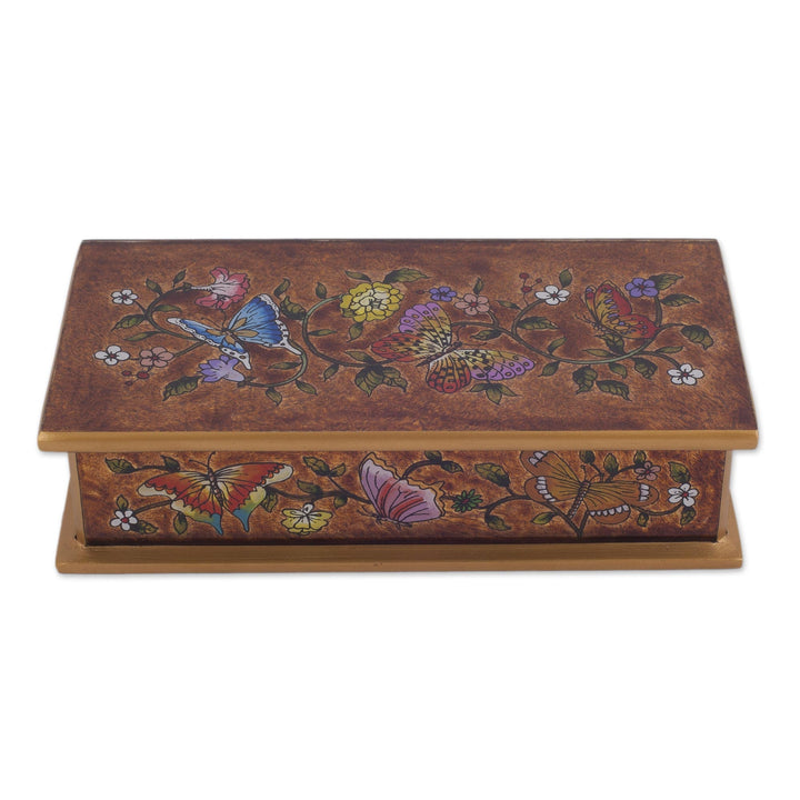 Fluttering butterflies are painted by hand against a field of sepia, to adorn decorating this decorative box from Peru. Following a meticulous process, Asunta Pelaez paints the motifs on the reverse side of glass panes for a wonderful clarity of color. The lid lifts open to a single-compartment interior for storing small objects and accessories.