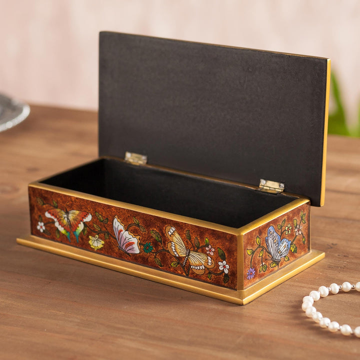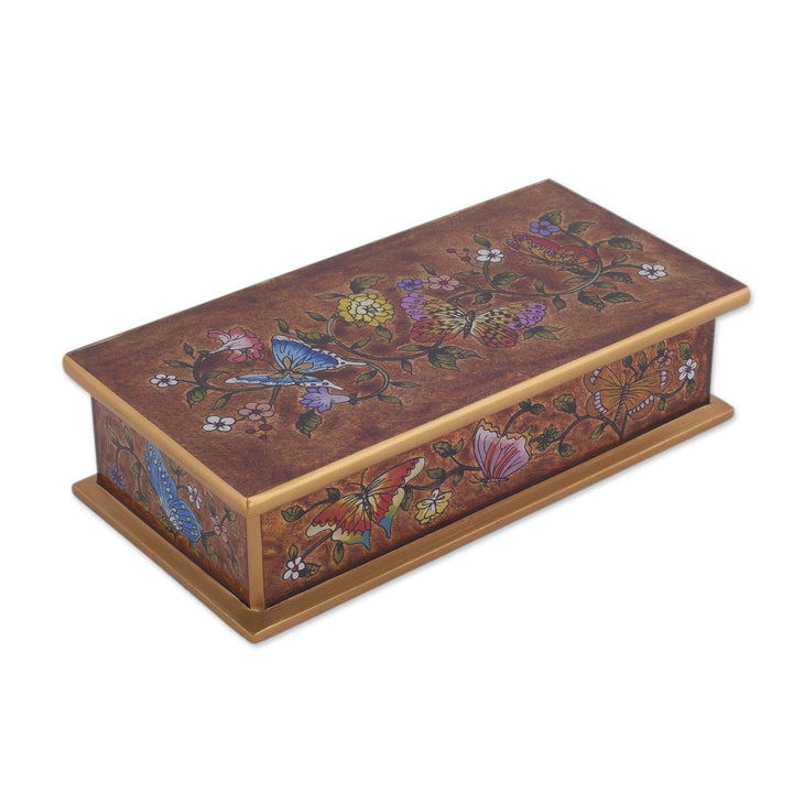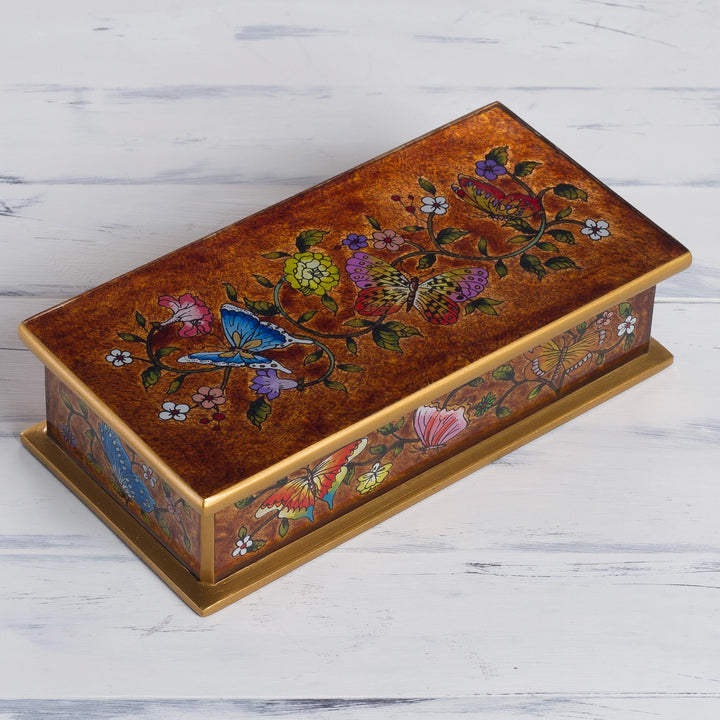 Fluttering butterflies are painted by hand against a field of sepia, to adorn decorating this decorative box from Peru. Following a meticulous process, Asunta Pelaez paints the motifs on the reverse side of glass panes for a wonderful clarity of color. The lid lifts open to a single-compartment interior for storing small objects and accessories.