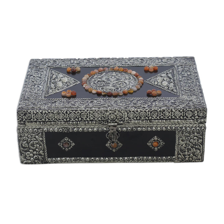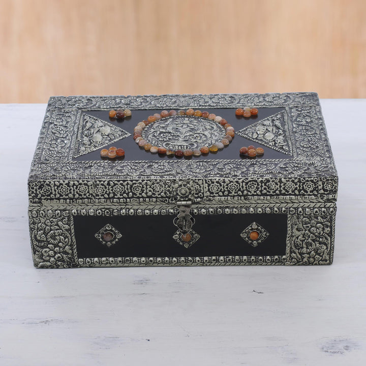 Khalid Ali crafts a piece of mango wood, covering it in brass repoussé bathed in nickel. Lavish floral motifs on sleek black bring their own charisma to this jewelry box. He then lines the box with velvet and adds a lift out tray for smaller treasures. Ornate handles, a mirror inside the lid, and a latch that can by locked complete the piece.