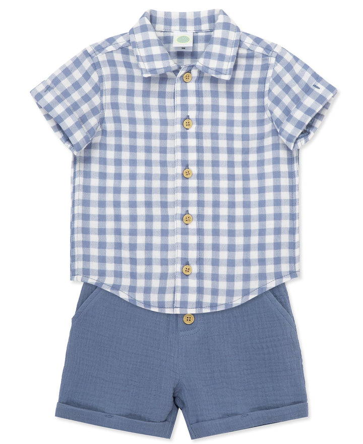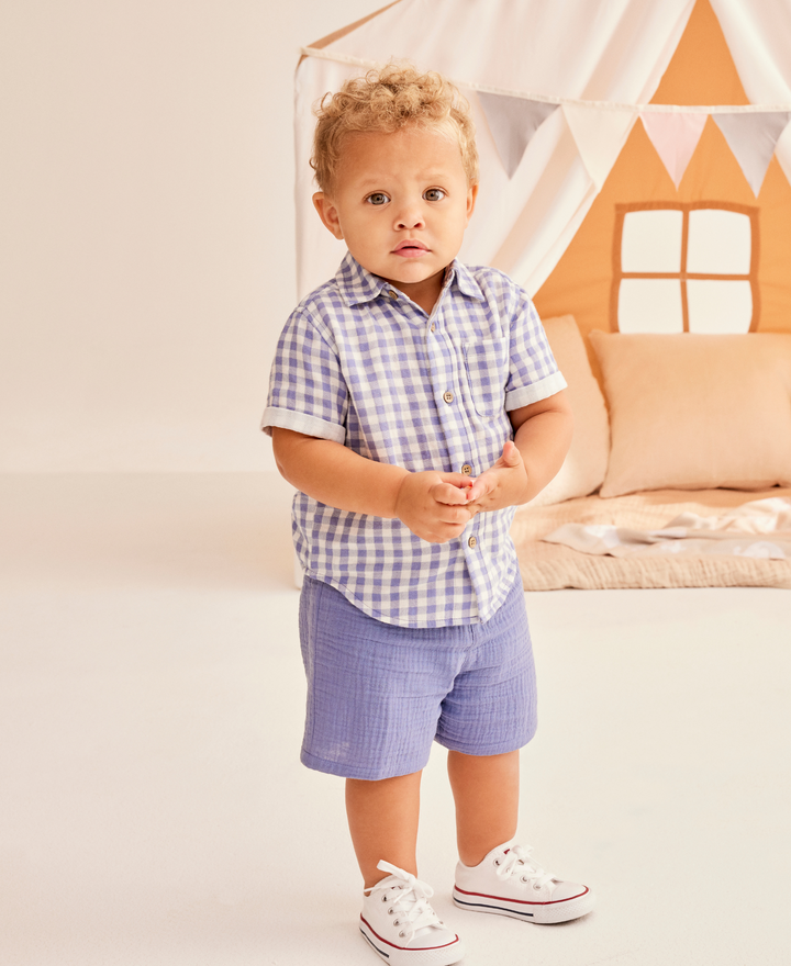- This boys' cotton gauze 2-piece short set is a classic, featuring a short-sleeve check button down and coordinating shorts!