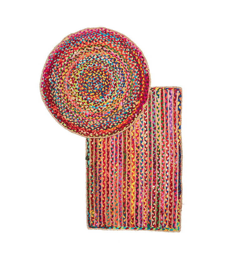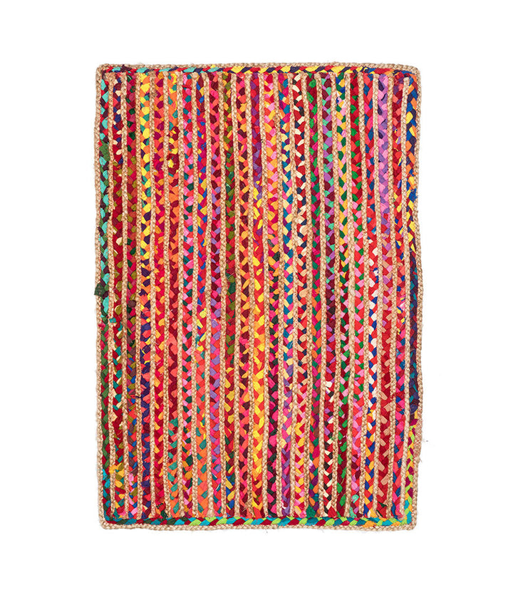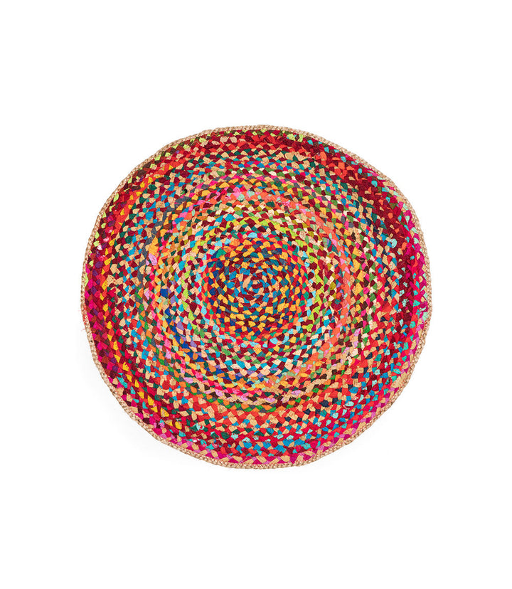 Add this colorful rug to any room to bring out accent colors. This decorative rug is expertly handcrafted with colorful, upcycled, braided chindi fabrics and jute.