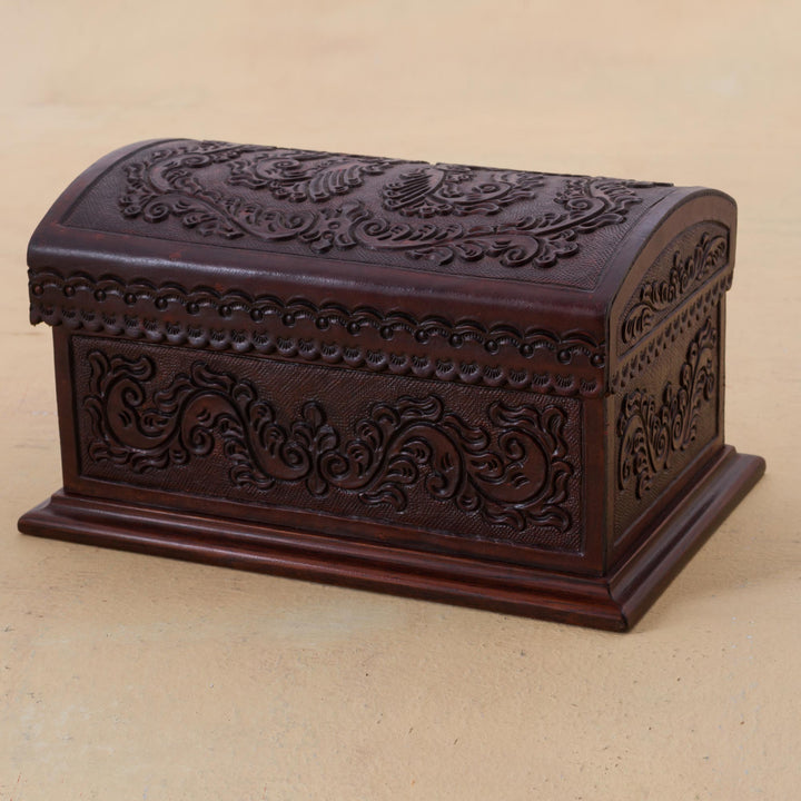 Add a touch of classic Peruvian art to your desk with this artisan crafted chest by Julio Sanchez. He covers the mohena wood box with quality leather embossed with leafy patterns suggesting a crest and a coat of arms - a veritable treasure chest.