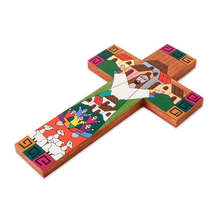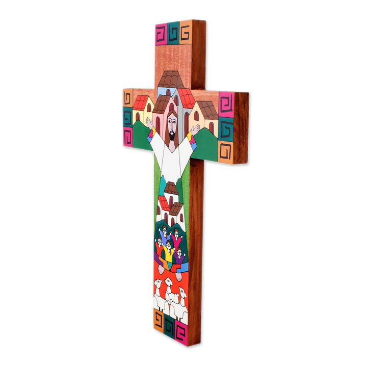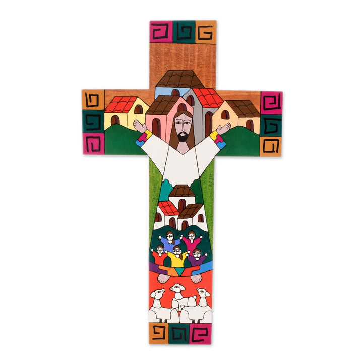 Maria Estela Perlera de Portillo hand paints this beautiful cross. The design celebrates the love an entire community. Jesus has his opens outstretched at the center of the cross while a village of colorful homes and happy people surround him.