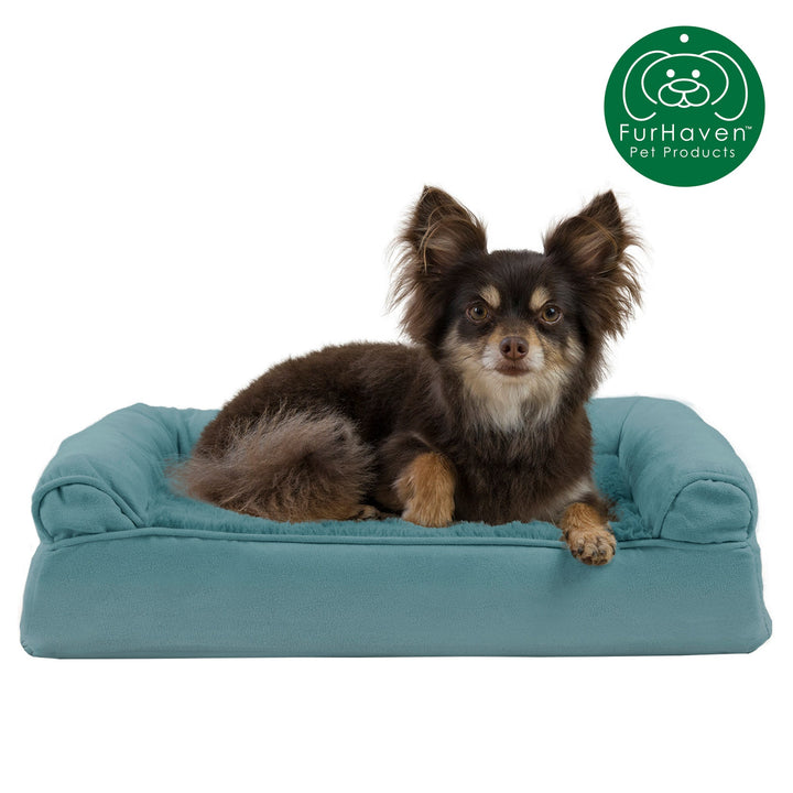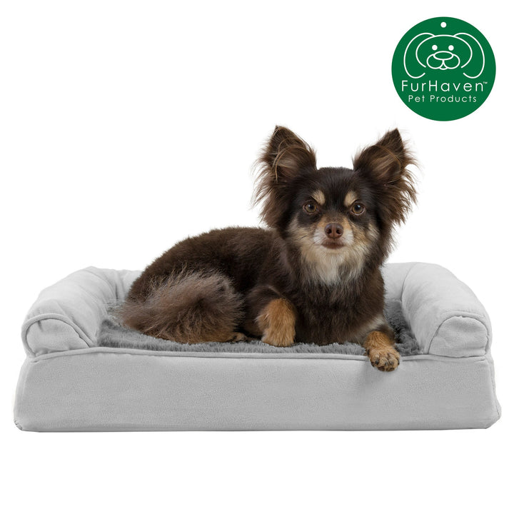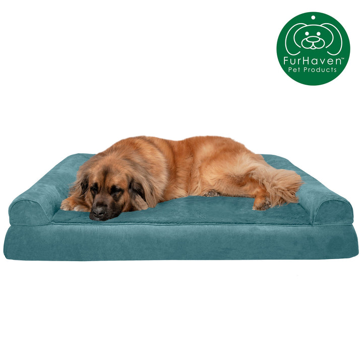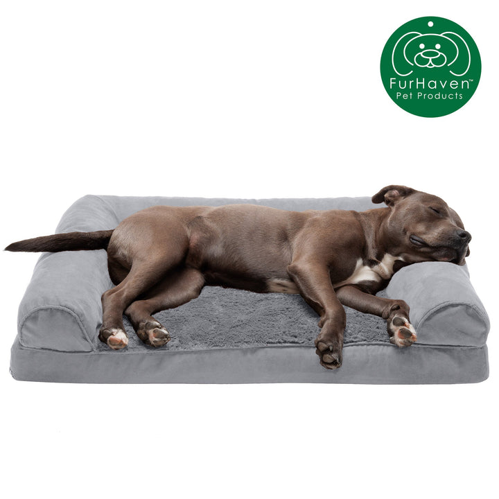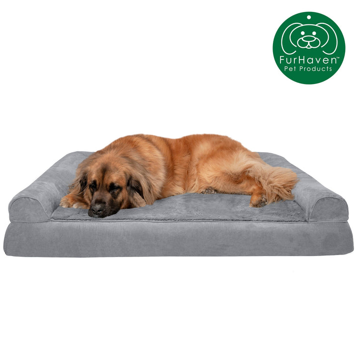 Perfect for pets young and old, the FurHaven Deluxe Plush and Suede Sofa-Style Orthopedic Pet Bed is designed to provide your loved one with maximum comfort for a good night's rest. With a soft, plush faux fur sleeping surface your dog will be more snug than a bug in a rug! The orthopedic ("egg crate") foam base supports your pet's joints and pressure points making this pet bed ideal for arthritic pets who have trouble getting comfortable. The Jumbo Plus option, for larger breeds, features solid slab orthopedic foam for greater support and comfort. Give your companion the luxury they deserve with this orthopedic dog bed. They'll love the suedine bolsters' soft but supportive feel provided on three sides giving them a variety of cozy positions to snuggle into. The bolsters are a great pillow for your pet to lie their head on or, for pets that like to cozy into your couch, they can snuggle close to the sides for a sense of security and warmth. Whatever position your pet likes to lay in, they'll find nothing but comfort and sweet dreams!