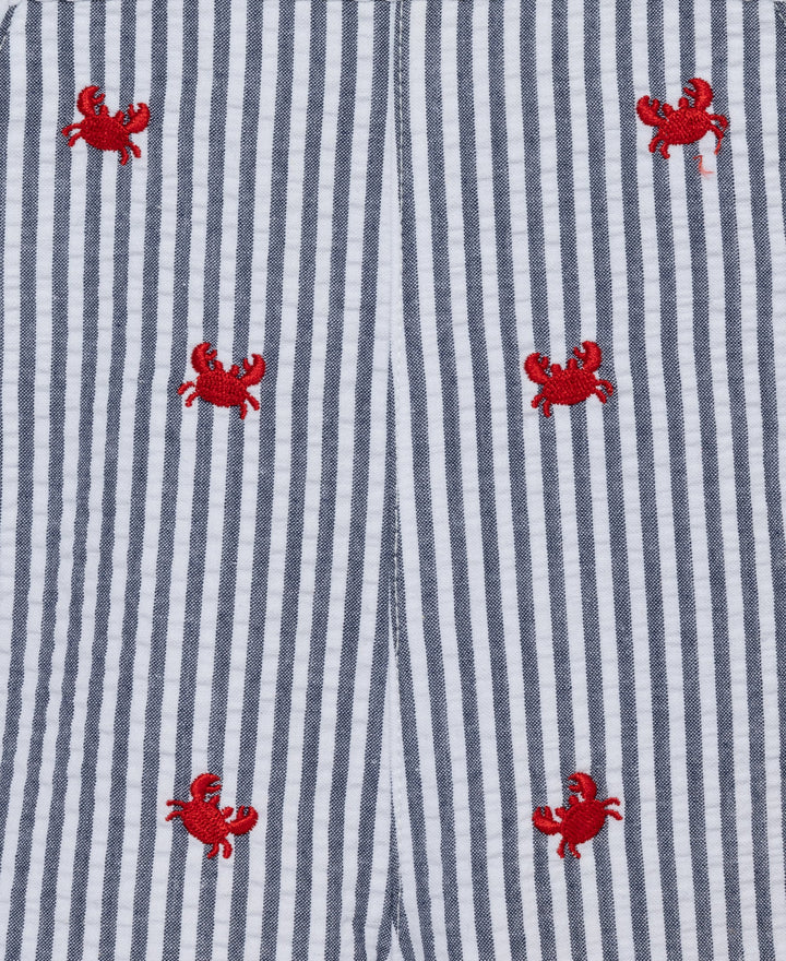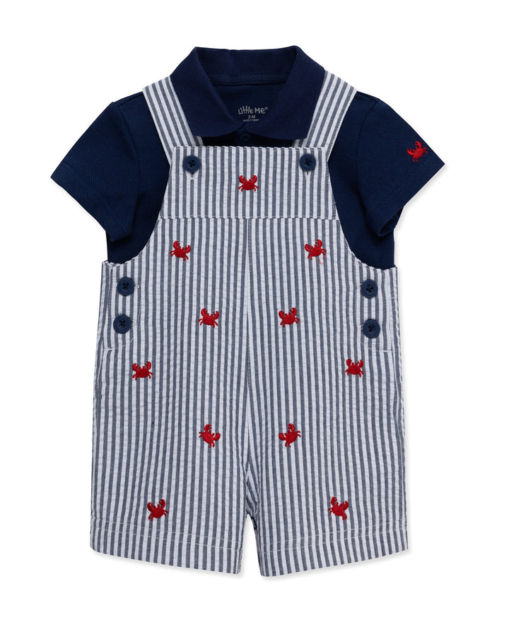 - A classic red polo shirt layers underneath a pair of baby boys' crab and stripe woven cotton shortalls, fastened with no-pinch buttons and snaps for easy changing.