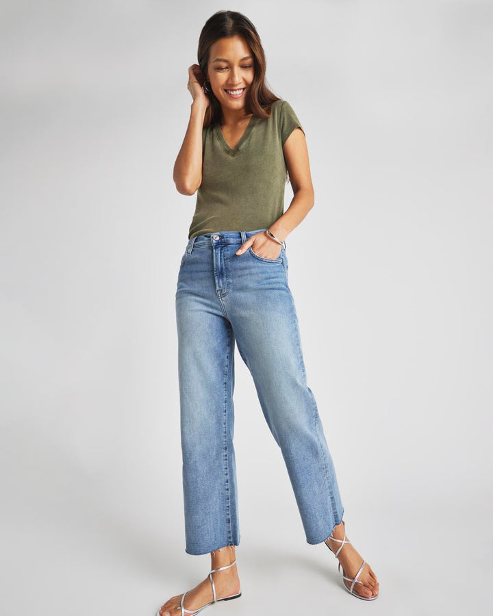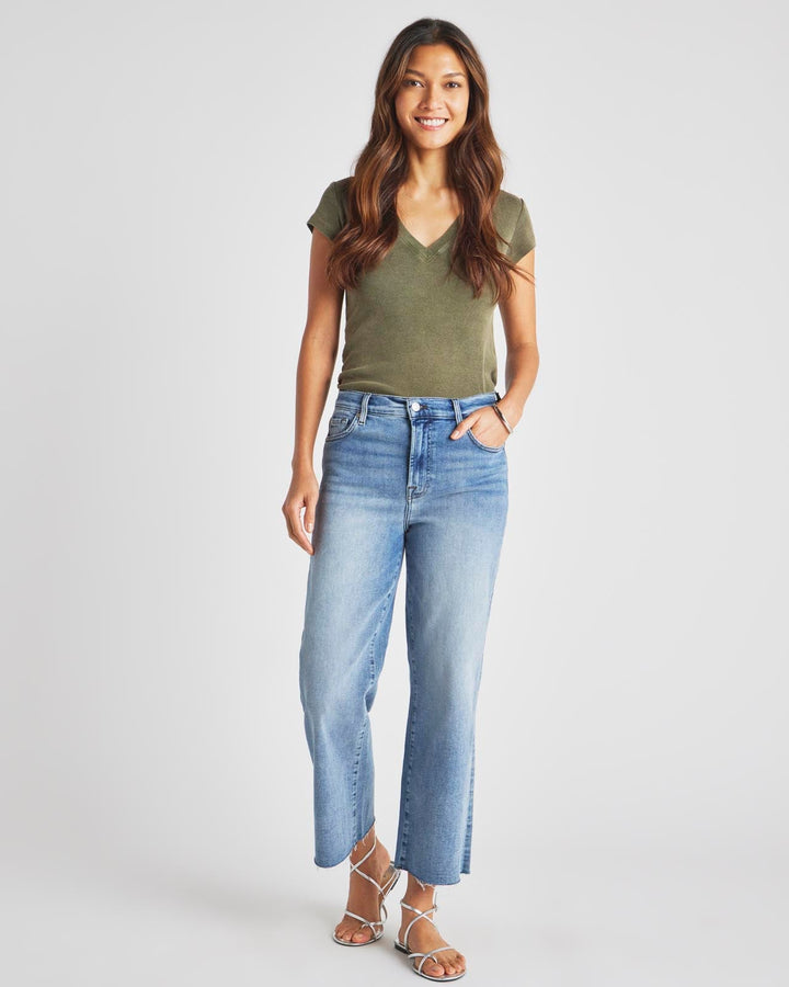 This effortless pair-- finished in clean white so it teams with all your favorite Splendid tops-- has a high rise waist with a slim fit through the hip and a cropped wide leg hem.