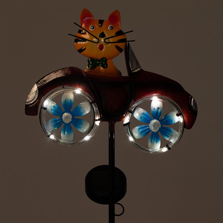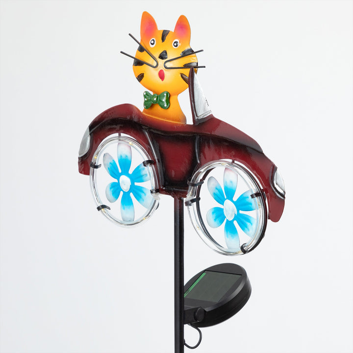 Illuminate your garden with the delightful charm of the Cruising Cat Solar Garden Stake. This whimsical garden accessory features an adorable orange cat driving a little car, adding a playful touch to your outdoor space.