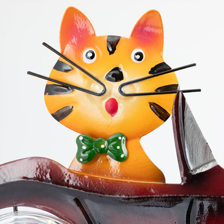 Illuminate your garden with the delightful charm of the Cruising Cat Solar Garden Stake. This whimsical garden accessory features an adorable orange cat driving a little car, adding a playful touch to your outdoor space.