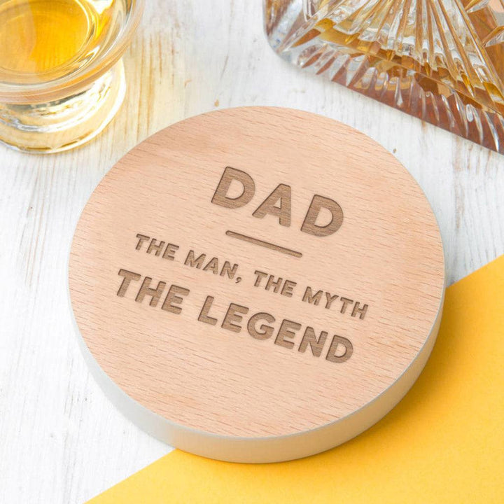 Each coaster will be custom engraved with the funny, yet sentimental quote 'Dad, The Man, The Myth, the Legend' and can be personalised to suit his personality with a choice of 8 vibrant colours for the edge of the coaster.