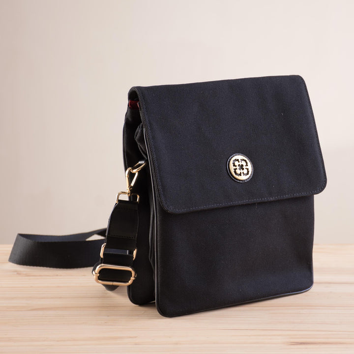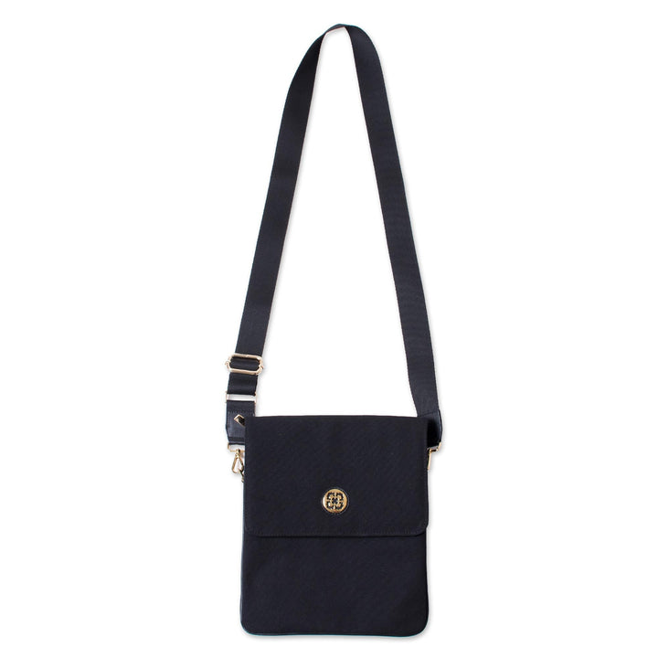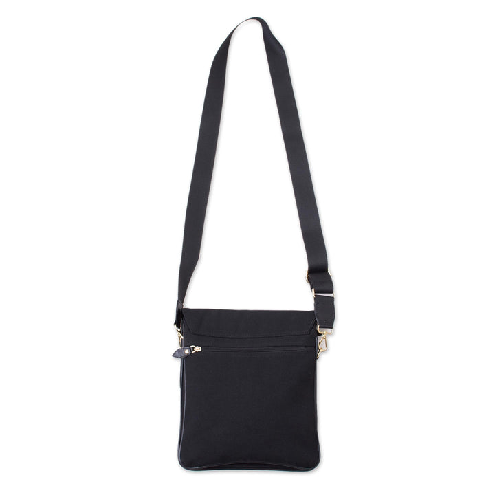 Dark and elegant, this sling is handcrafted of black cotton fabric with leather trim. Peruvian duo Karina and Maybee present the sling, accentuated at the front with a metallic and leather medallion. The bag drapes over the shoulder on a removable, adjustable strap, and is equipped with a handy zipper pocket at the back. The front flap opens with magnetic snaps, revealing a three-compartment cotton lining with zipper closures and interior pockets.