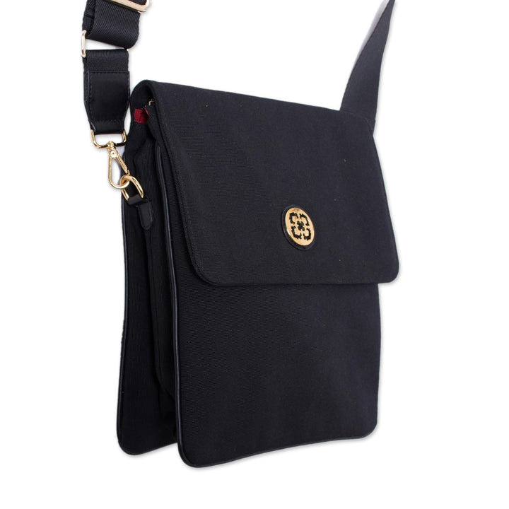 Dark and Elegant Leather Accent Cotton Handbag in Black from Peru