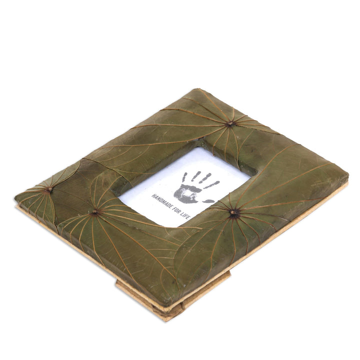 The NOVICA Indonesia Market Picks collection presents a photo frame that defines natural beauty. The frame is handcrafted from the leaves of the kupu-kupu or butterfly tree and rice straw paper with a card stock backing and a glass pane. The olive green front has a rich texture that showcases the veins of each leaf. Designed to display a 2 x 3 inch photo either vertically or horizontally, the frame can be placed on a tabletop or other flat surface.
