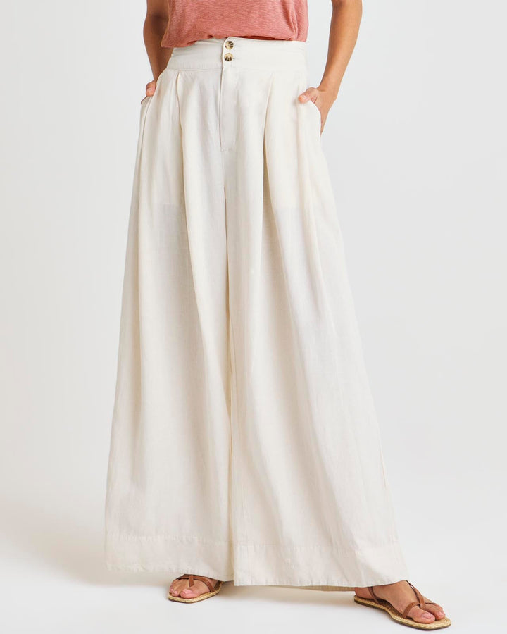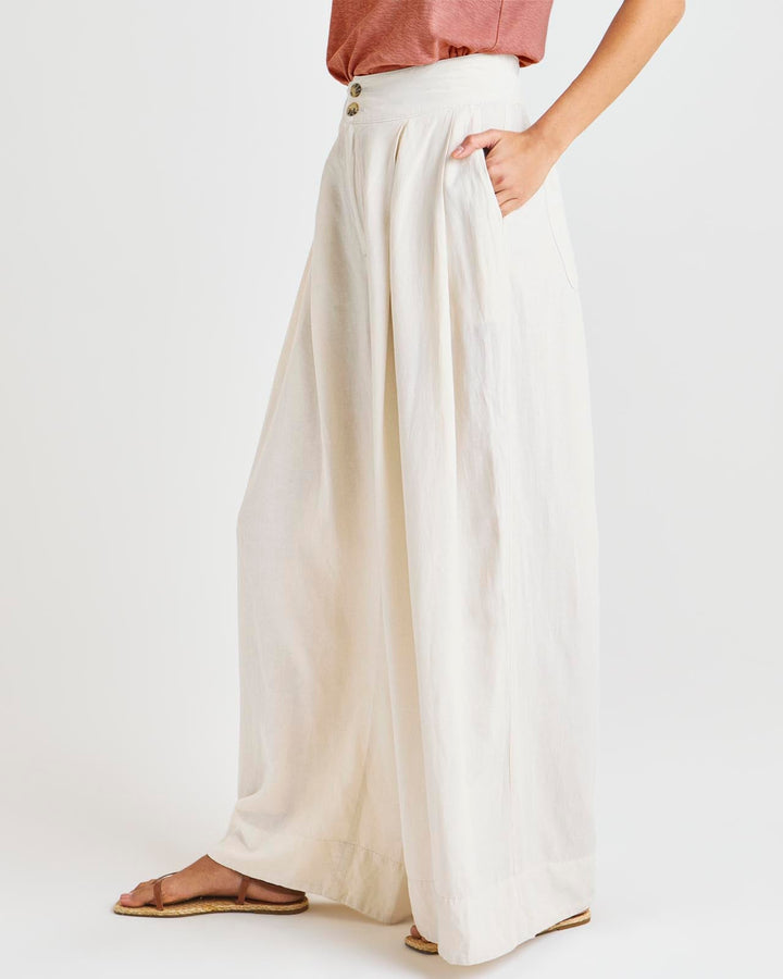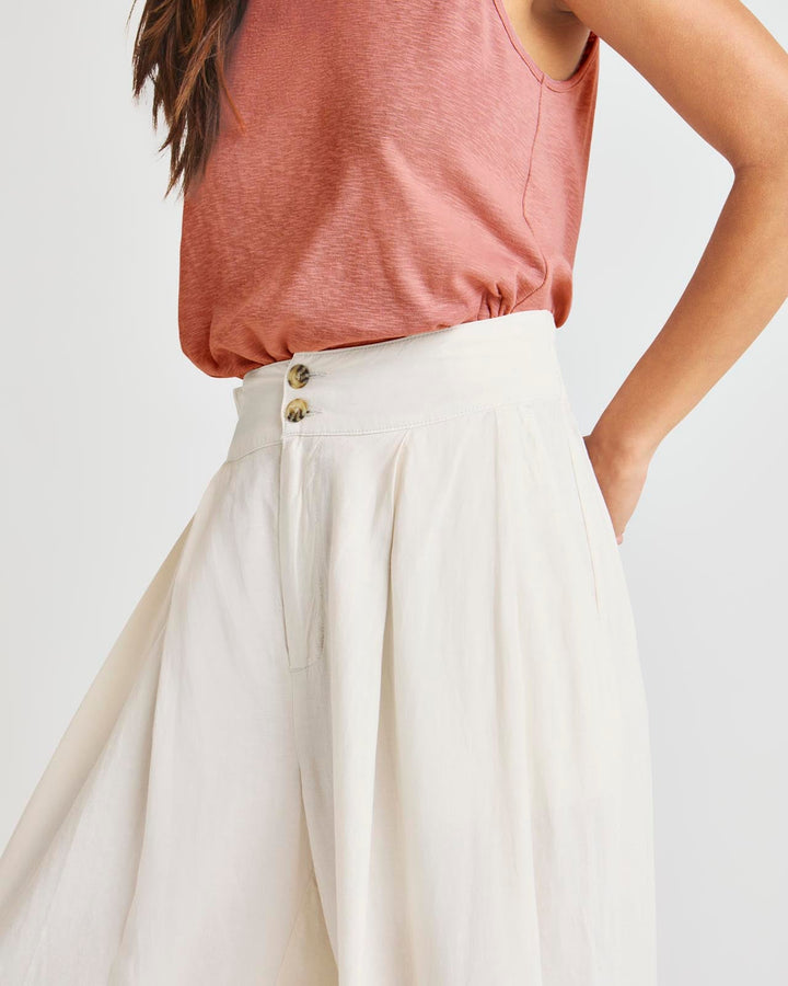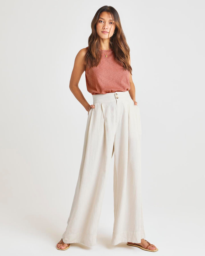 Our Delancey Wide Leg Pant has all the makings of an elevated, put-together trouser without sacrificing comfort. Made from a breezy linen blend that inspires a summer mood. Its stretchy high-rise waist features charming tortoise buttons, while its flowy wide leg offers so much movement-- plus front and back pockets for the win.
