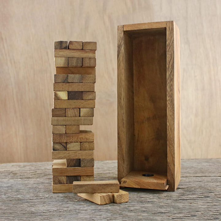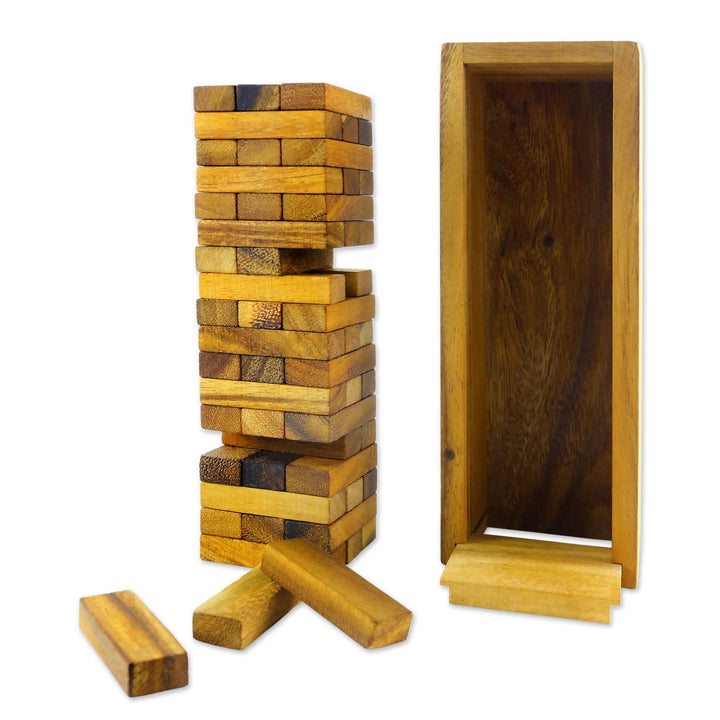 A looming tower composed of many small bricks is the centerpiece for this game from Thailand. Stacking the blocks that are hand-carved from rain tree wood, the goal is to take turns removing them one by one without toppling the tower. An excellent game for two or more players, it is presented by Waraporn Khamsuk, finished with a box for housing the wood bricks.