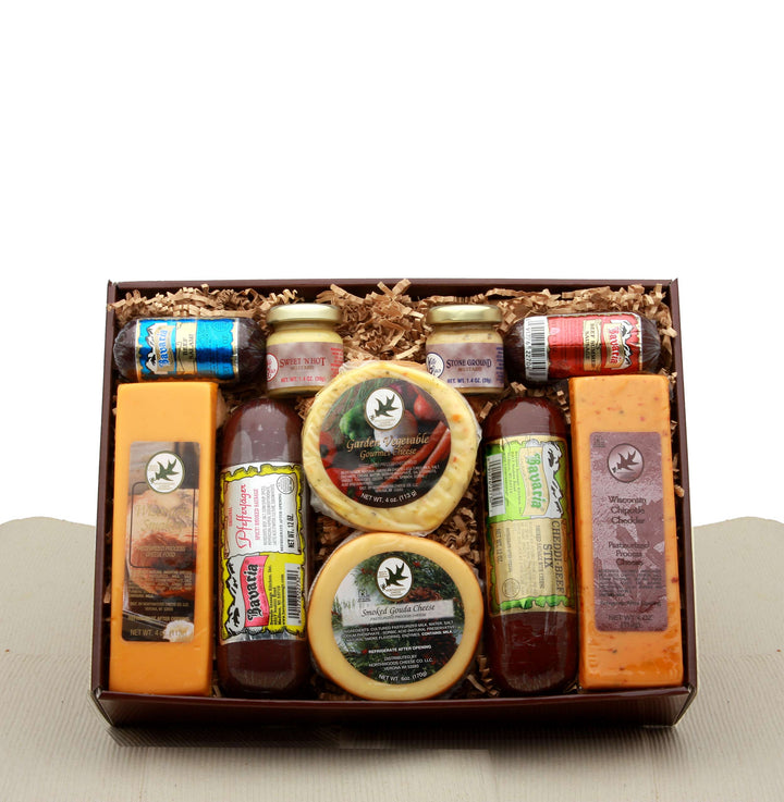 Includes: 6 oz Smoked Gouda cheese round,Garden Vegetable swiss cheese round, 1.4 oz Sweet N Hot mustard. 1.4 oz Stone ground mustard, 5 oz bavarian summer sausage, 5 oz Bavarin Beef salami, 12 oz Bavarian Pfefferjager Sausage ( Spicy smoked sausage) 12 oz bavarian Cheddar Beef smoked sausage, 4 oz Wisconsin Cheddar with Chipotle cheese bar, 4 oz Wisconsin Smokey Cheddar bar, brown gloss gift box measures 12x9x4. This gift comes wrapped in cellophane and topped with a natural raffia bow.