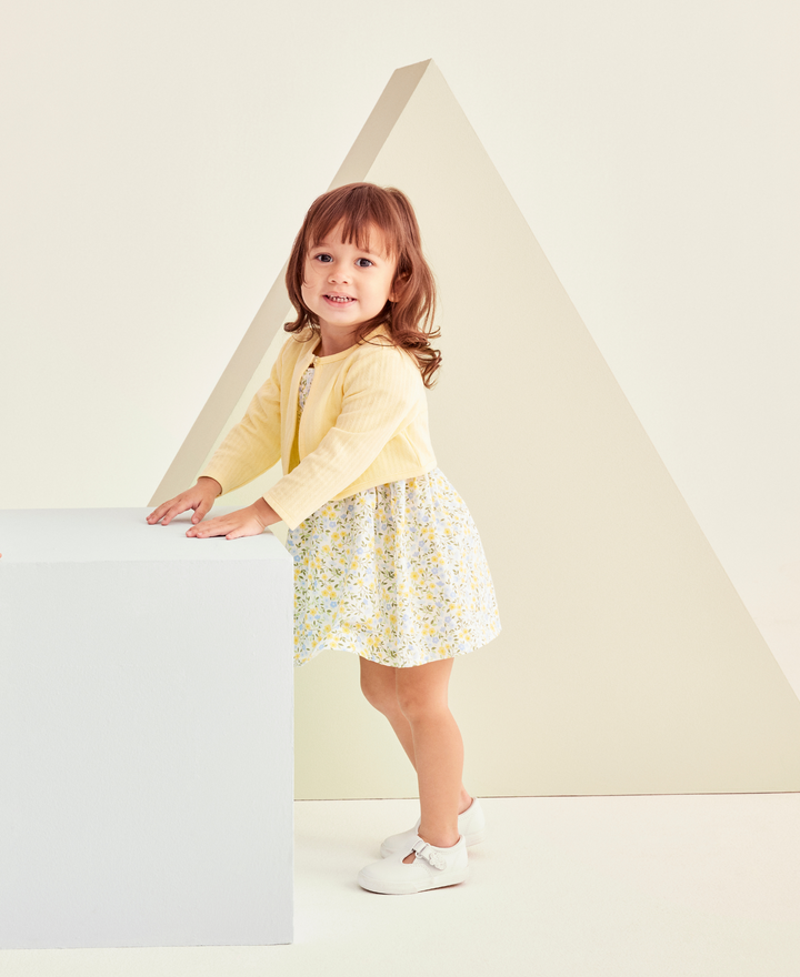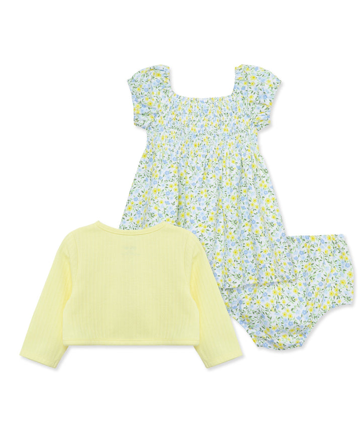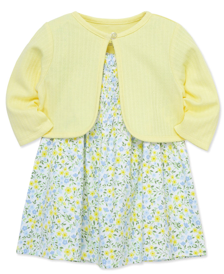 - Garden flowers flourish across this girls' knit dress set. Pair the dress with matching garden flower printed panties and yellow cardigan for the perfect springtime outfit!