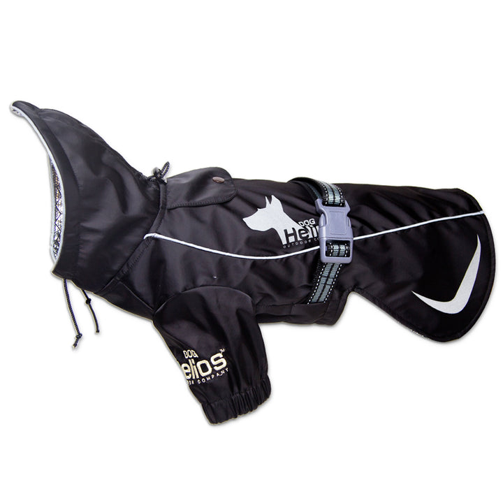 The Dog Helios 'Ice-Breaker' Extendable Hooded Dog Coat is inner lined with Heat Reflection Technology, a specially developed Lightweight inner barrier that Reflects back Natural Body heat back into the body. The Ice-Breaker Dog Jacket also features a dual extendable hood design with dual jawstrings that extend and cover a larger portion of the facial area to prevent colder air from entering. The sleeves offer elastic stitching that conform to proper leg girths with a waist buckle that adjusts to various dog chest sizes to further seal out the outdoor frigid air temperatures while offering a more premium and comfortable fit. The Exterior shell is Waterproof Coated and Features Reflective Tubing and Printing throughout the body.