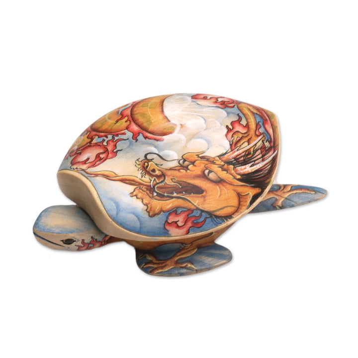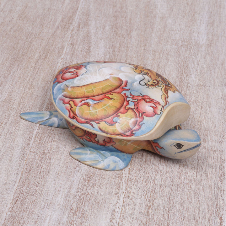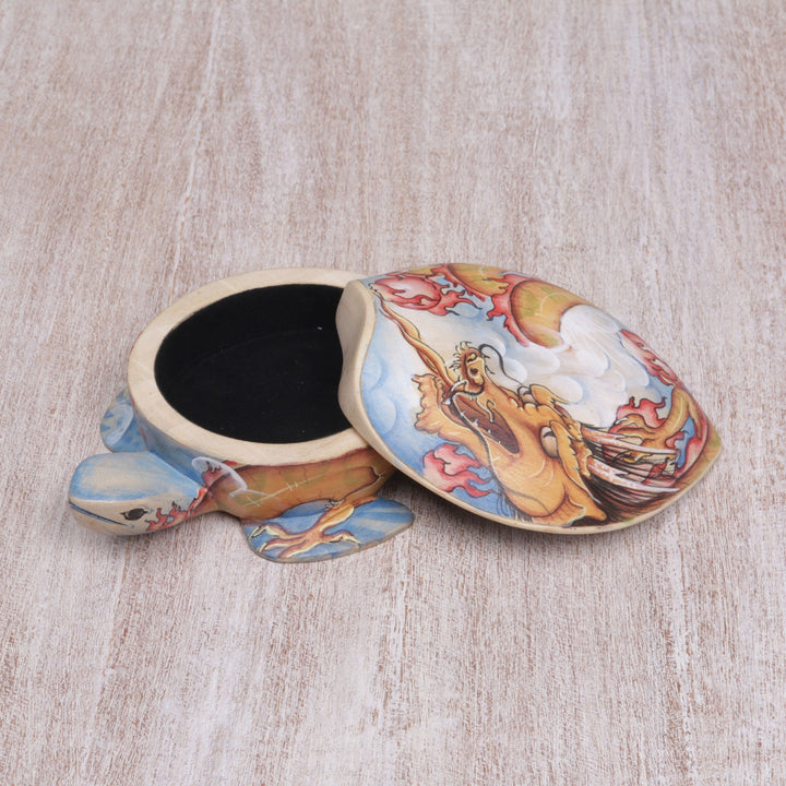 Made from crocodile wood, the turtle peers upwards from under Gusti Ngurah Semarajaya's hand-painted dragon. The flaming coils of a golden dragon spread out over the sky-colored shell and flippers of a humble turtle in this unique jewelry box. Removing the top of the shell reveals a space lined in black polyester velvet for storing small valuables or jewelry.